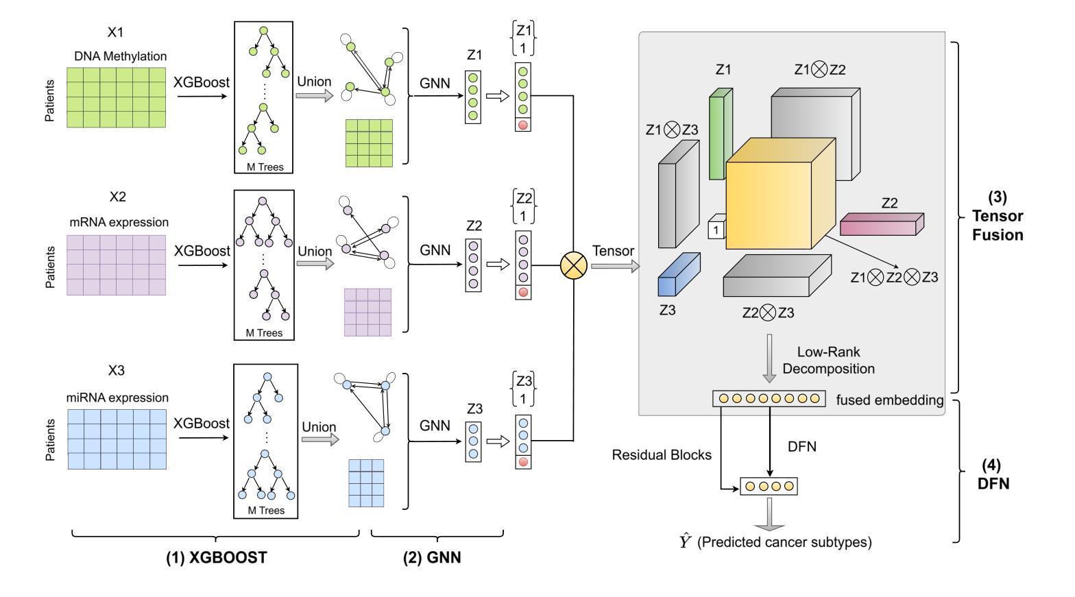 - 它结合了树结构导向加权图与张量融合机制,处理多组学数据的异质性、高维性以及复杂的内外模态依赖问题。