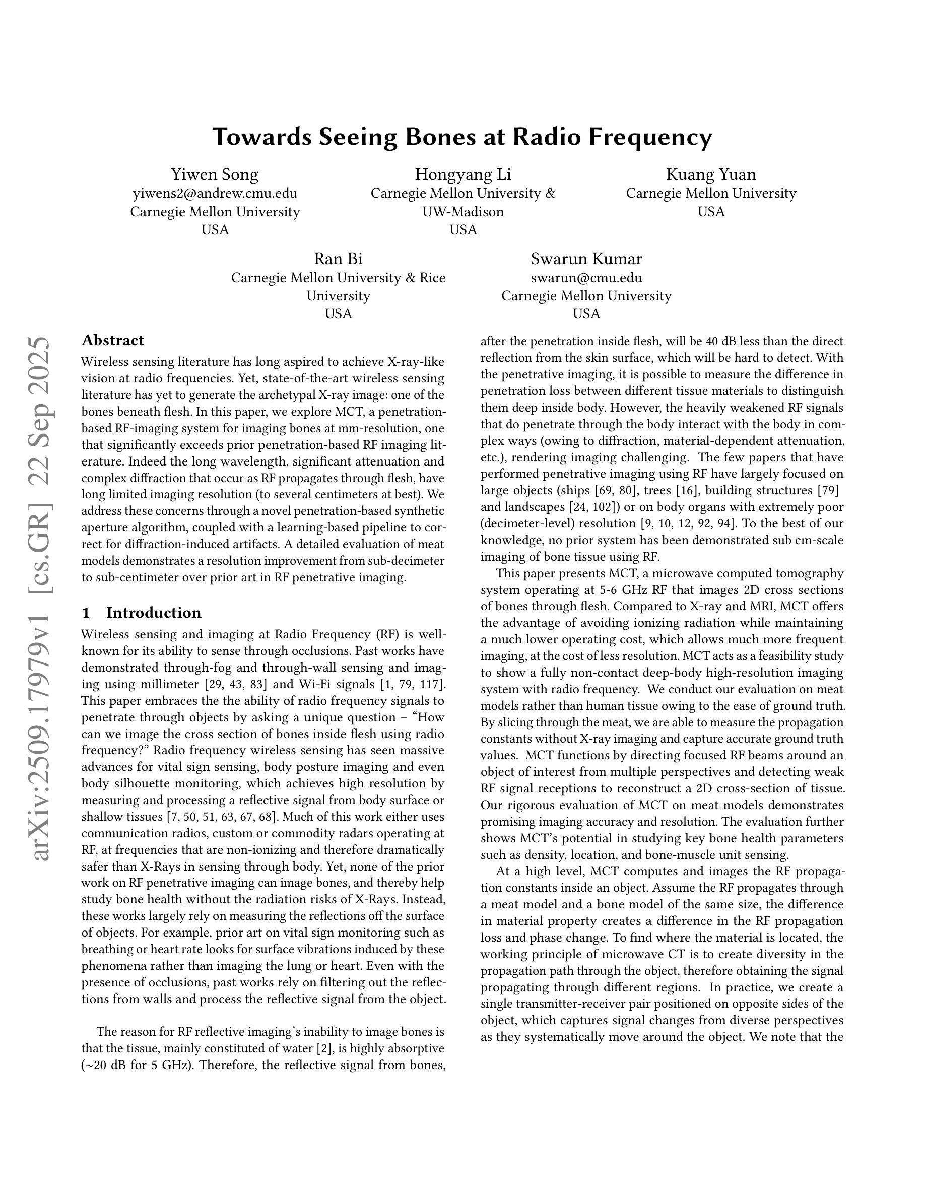 本文探索了一种基于穿透的RF成像系统MCT,能够以毫米级分辨率成像骨骼,显著超越了之前的穿透式RF成像文献。针对RF信号在传播过程中受到的长波长、大幅衰减和复杂衍射问题,该文提出了一种新型穿透式合成孔径算法,并结合学习管道校正衍射引起的伪影。对肉类模型的详细评估显示,在射频穿透成像方面,其分辨率较之前的技术有所提升,从分米级提高到了厘米级。