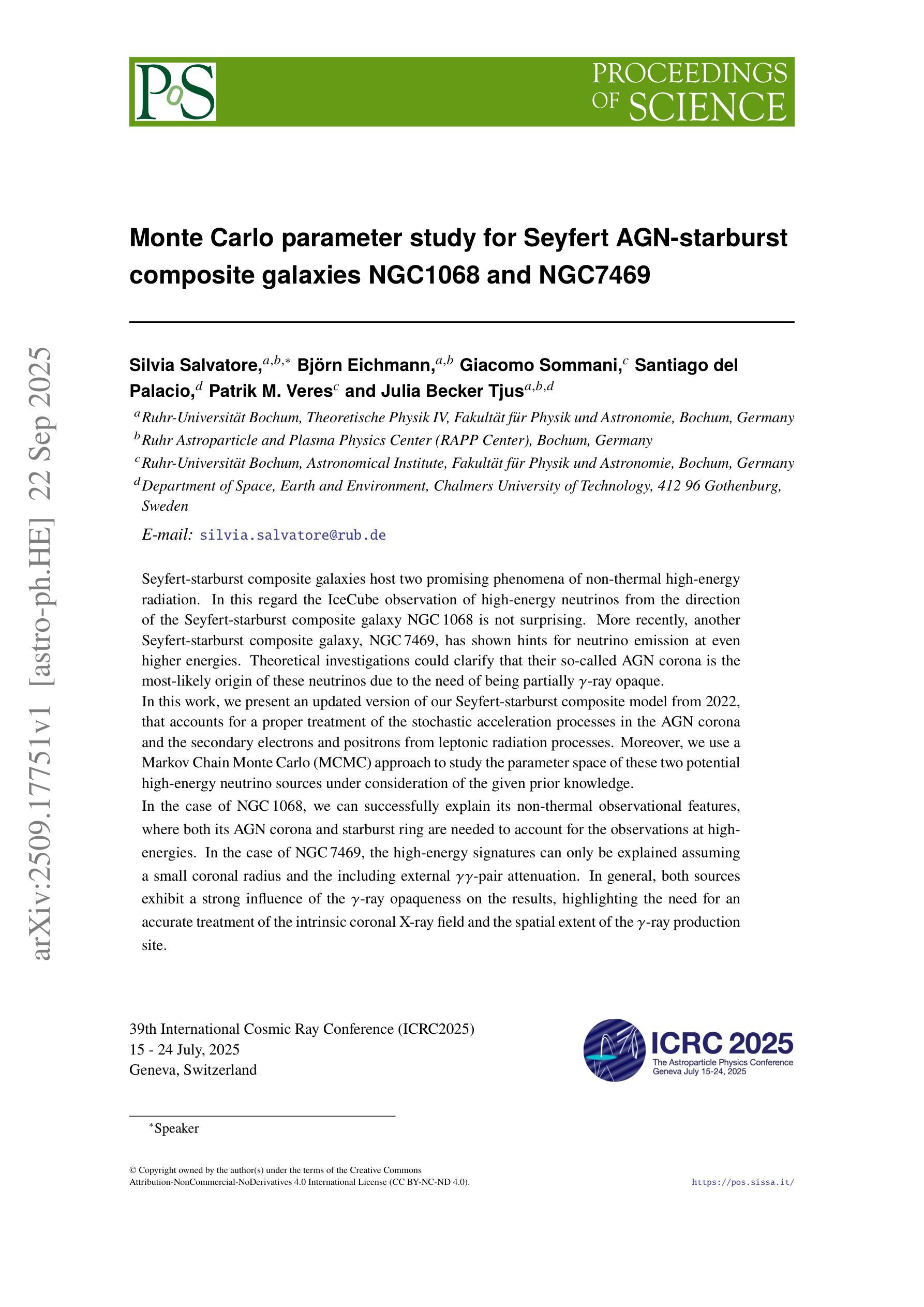 塞弗特星爆发复合星系有两种具有前景的非热高能辐射现象。因此,从塞弗特星爆发复合星系NGC 1068方向观测到IceCube的高能中微子并不意外。最近,另一个塞弗特星爆发复合星系NGC 7469显示出更高能量下的中微子发射迹象。理论研究表明,由于需要部分γ射线不透性,所谓的活动星系核冕可能是这些中微子的最可能来源。在这项工作中,我们展示了更新后的塞弗特星爆发复合模型(2022版),该模型考虑了活动星系核冕中随机加速过程的适当处理以及来自轻子辐射过程的次级电子和正电子。此外,我们使用马尔可夫链蒙特卡罗(MCMC)方法,根据已有的先验知识来研究这两个潜在的高能中微子源的参数空间。对于NGC 1068,我们可以成功解释其非热观测特征,其中既需要其活动星系核冕也需要其星爆环来解释高能观测结果。对于NGC 7469,高能特征只能假设较小的冕半径并包括外部γγ对衰减才能得到解释。总的来说,两个源的结果都强烈受到γ射线不透性的影响,这强调了需要准确处理内在的冠状X射线场和γ射线产生部位的空间范围。