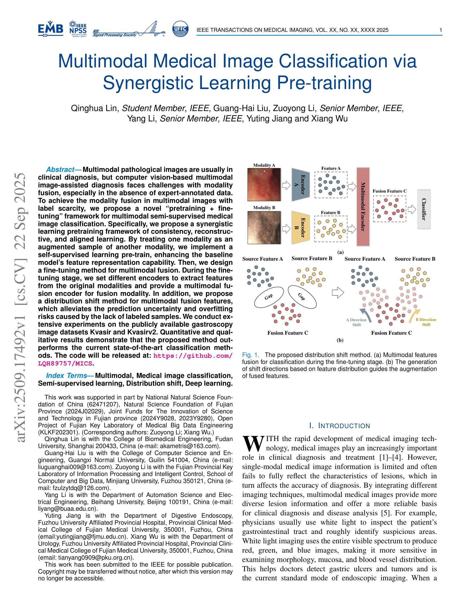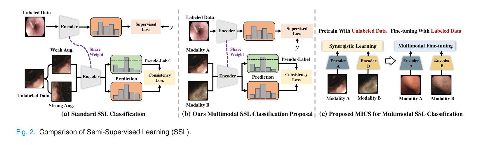 在临床医学诊断中,多模态医学图像的使用变得越来越普遍。然而,在缺乏专家标注数据的情况下,多模态图像融合面临挑战。为此,我们提出了一种新型的“预训练+微调”框架,用于进行半监督多模态医学图像分类。通过一致性、重建和对齐学习的协同学习预训练框架,提高基线模型的特征表示能力。随后设计了一种微调方法进行多模态融合。实验证明,该方法在公开可用的胃镜图像数据集Kvasir和Kvasirv2上表现出优异性能。