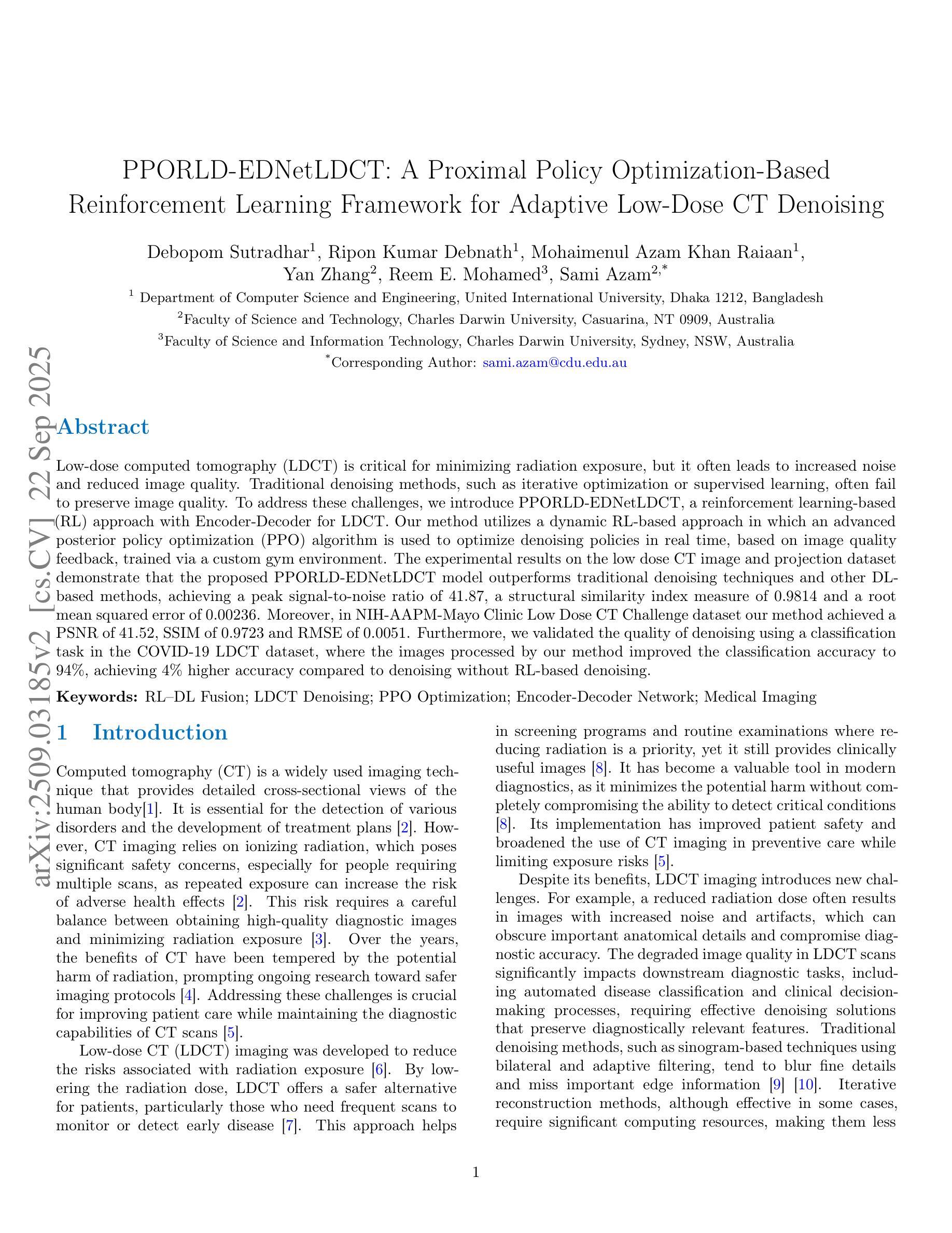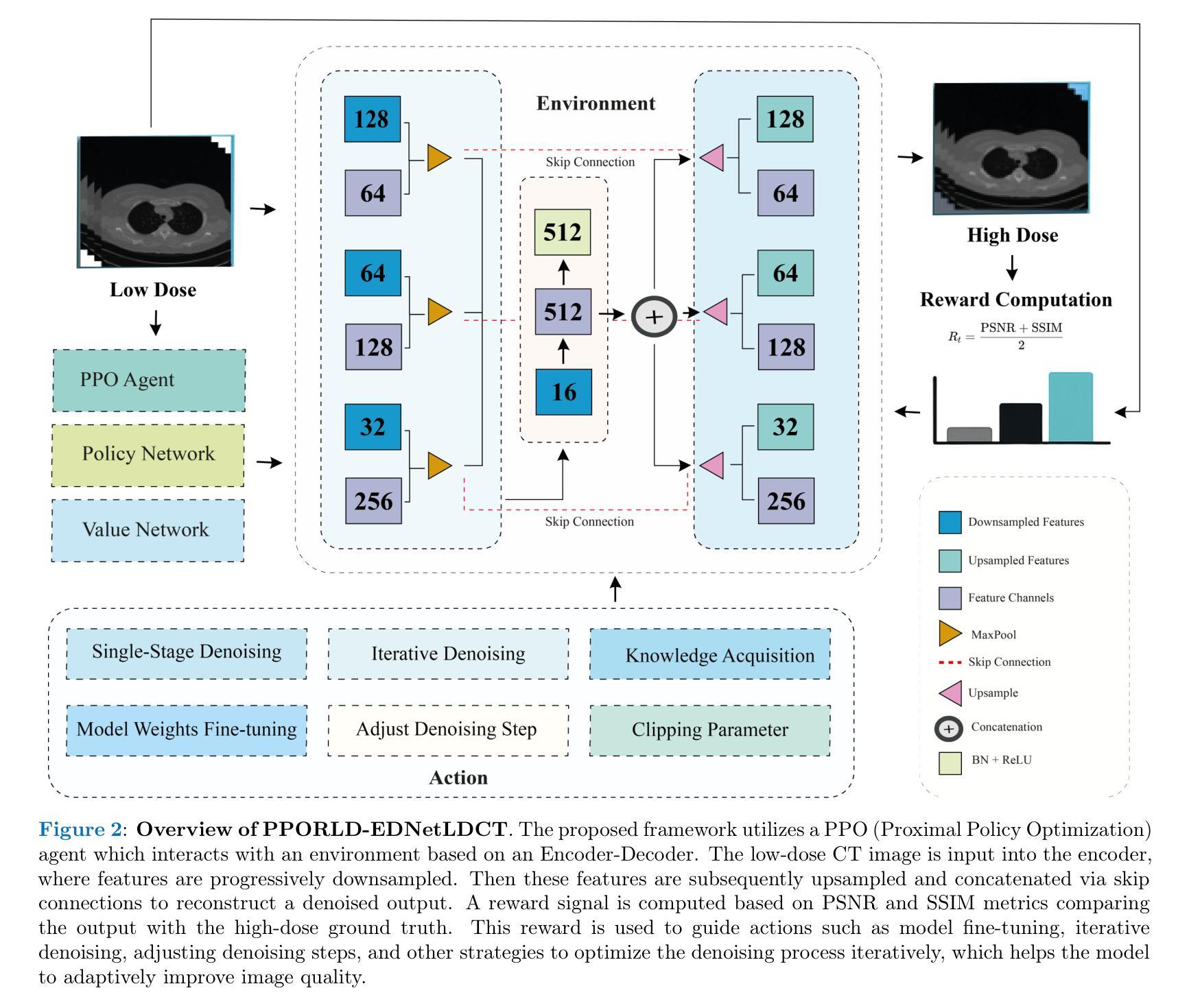低剂量计算机断层扫描(LDCT)对于最小化辐射暴露至关重要,但通常会导致噪声增加和图像质量下降。传统的降噪方法,如迭代优化或监督学习,往往无法保持图像质量。为了解决这些挑战,我们引入了PPWORLD-EDNetLDCT,这是一种基于强化学习(RL)的LDCT编码器-解码器方法。我们的方法采用动态RL方法,使用先进的后验策略优化(PPO)算法,根据图像质量反馈实时优化降噪策略,并通过自定义的gym环境进行训练。在低剂量CT图像和投影数据集上的实验结果表明,所提出的PPWORLD-EDNetLDCT模型优于传统降噪技术和其他深度学习方法,达到峰值信噪比41.87,结构相似性指数测量值为0.9814,均方根误差为0.00236。此外,在NIH-AAPM-Mayo Clinic低剂量CT挑战赛数据集上,我们的方法达到了PSNR 41.52、SSIM 0.9723和RMSE 0.0051。此外,我们在COVID-19 LDCT数据集中通过分类任务验证了降噪质量,使用我们方法处理的图像提高了分类精度至94%,与未使用RL的降噪相比,提高了4%的准确率。