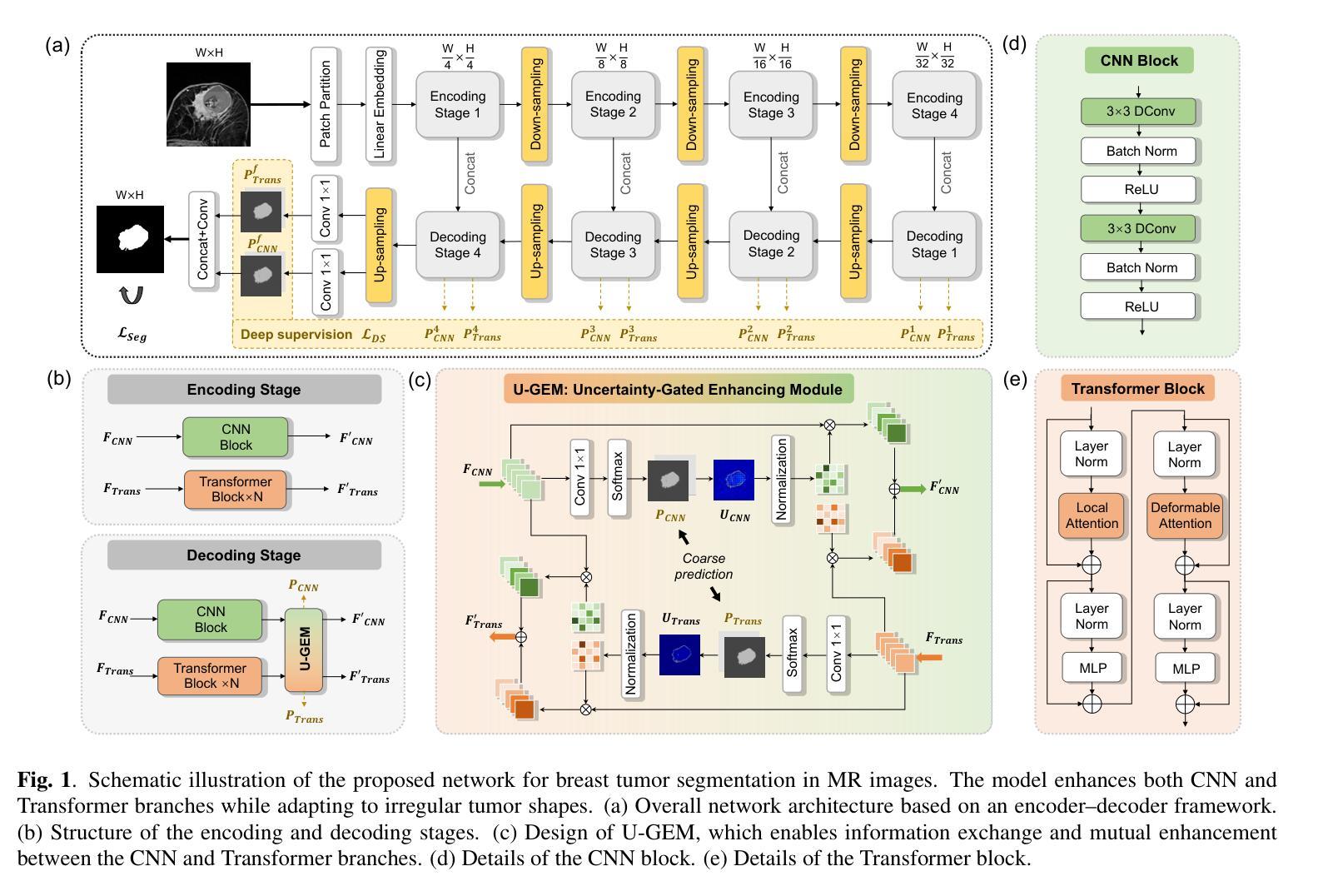 在磁共振图像(MRI)中对乳腺癌肿瘤进行精确分割对于乳腺癌诊断至关重要。然而,现有方法在捕捉不规则肿瘤形状以及有效地整合局部和全局特征方面面临挑战。为了解决这些局限性,我们提出了一种不确定性门控可变形网络,以利用CNN和Transformer的互补信息。具体来说,我们将可变形特征建模融入卷积和注意力模块,为不规则肿瘤轮廓提供自适应感受野。我们还设计了一个不确定性门控增强模块(U-GEM),该模块根据像素级不确定性有选择地交换CNN和Transformer之间的互补特征,增强了局部和全局表示。此外,还引入了一种边界敏感深度监督损失,以进一步改善肿瘤边界的勾勒。在两个临床乳腺癌MRI数据集上的综合实验表明,我们的方法与最新方法相比,在分割性能上取得了优势,突显了其在准确描绘乳腺癌肿瘤方面的临床潜力。