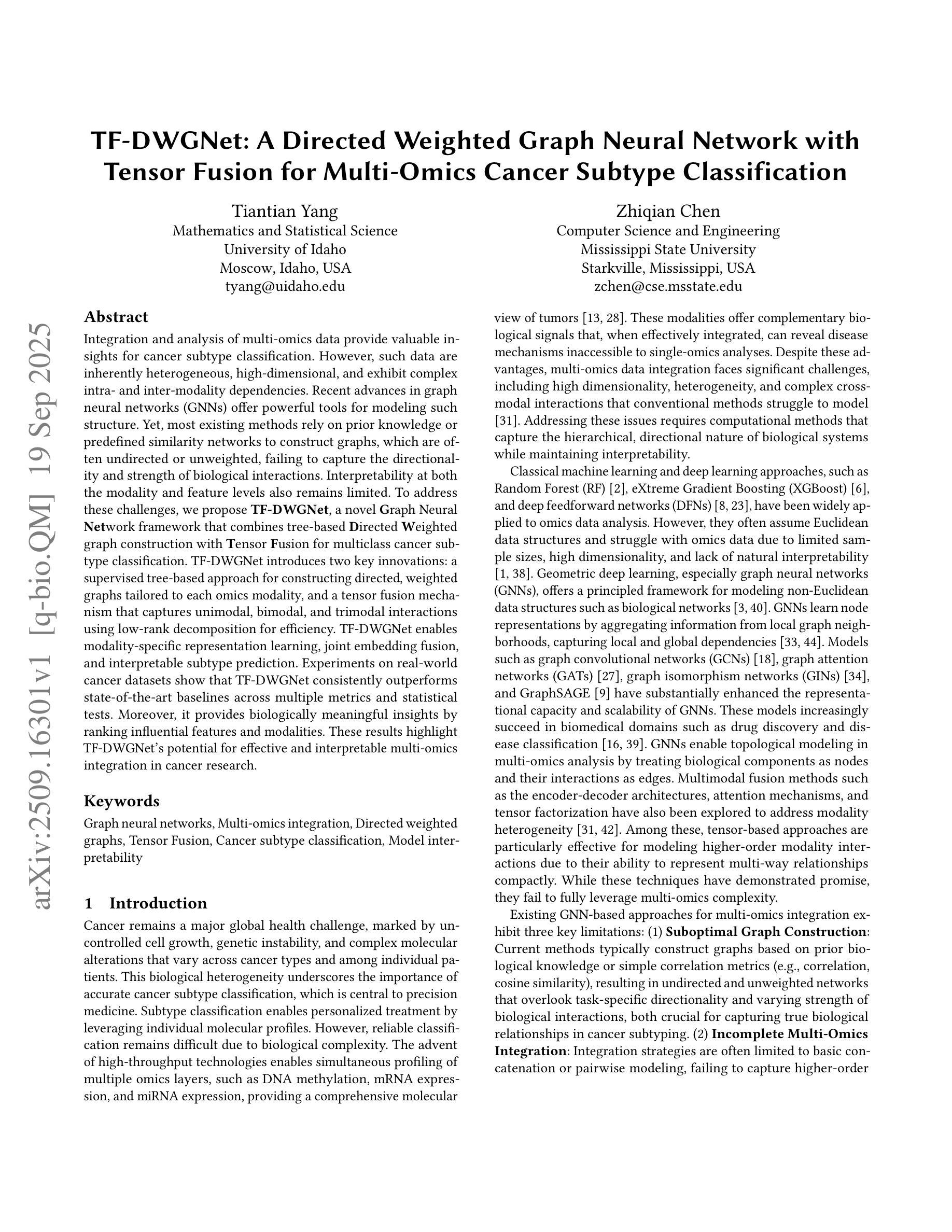 本文提出了TF-DWGNet,一种结合树结构导向加权图与张量融合的新型图神经网络框架,用于多类癌症亚型分类。TF-DWGNet解决多组学数据集成中的挑战,包括构建针对每种组学模态的有监督的基于树的定向加权图,以及捕捉单模态、双模态和三模态交互的张量融合机制。实验表明,TF-DWGNet在真实世界癌症数据集上的表现优于现有技术,并提供了具有生物学意义的信息。