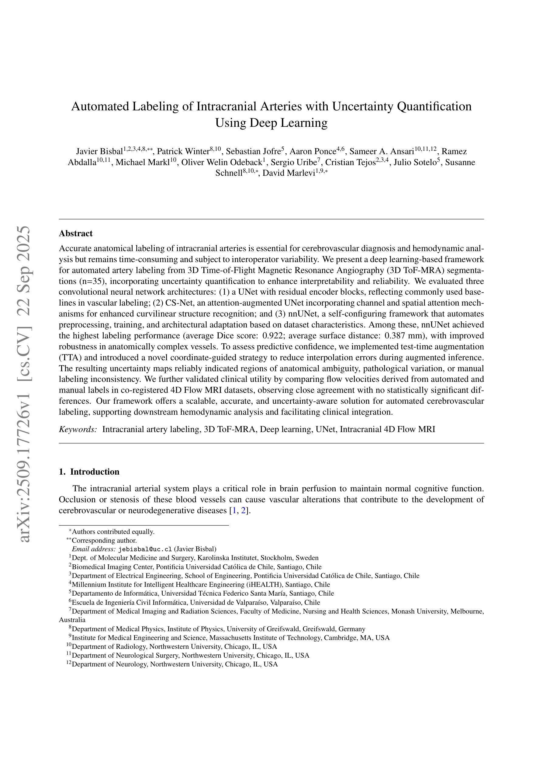 本文介绍了一种基于深度学习的自动化颅内动脉标注框架,应用于3D时间飞行磁共振血管造影(3D ToF-MRA)分割。该框架结合不确定性量化,提高了解释性和可靠性。评估了三种卷积神经网络架构,最终发现nnUNet在解剖复杂血管中表现出最高的标注性能。通过测试时间增强和一种新的坐标引导策略,该框架的不确定性地图能可靠地指示解剖模糊、病理变化或手动标注不一致的区域。此外,通过与手动标签在注册的4D血流MRI数据集上的流速对比,验证了其临床实用性。该框架为下游血流动力学分析和临床整合提供了可扩展、准确和考虑不确定性的解决方案。