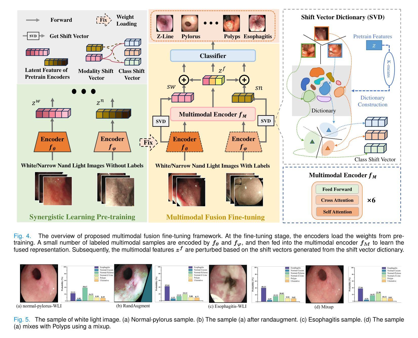 多模态病理图像在临床诊断中通常很重要,但基于计算机视觉的多模态图像辅助诊断在模态融合方面面临挑战,特别是在缺乏专家标注数据的情况下。为了实现标签稀缺情况下的多模态图像模态融合,我们提出了一种新的“预训练+微调”框架用于多模态半监督医学图像分类。具体来说,我们提出了一个协同学习预训练框架,包括一致性、重建和对齐学习。通过将一种模态视为另一种模态的增强样本,我们实现了自监督学习预训练,提高了基线模型的特征表示能力。然后,我们设计了一种用于模态融合的微调方法。在微调阶段,我们设置不同的编码器从原始模态中提取特征,并提供一个多模态融合编码器进行融合模态。此外,我们提出了一种多模态融合特征分布转移方法,这减轻了由于缺少标记样本导致的不确定性预测和过拟合风险。我们在公开可用的胃镜图像数据集Kvasir和Kvasirv2上进行了大量实验。定量和定性结果表明,所提出的方法优于当前最先进的分类方法。代码将在以下网址发布:https://github.com/LQH89757/MICS 。