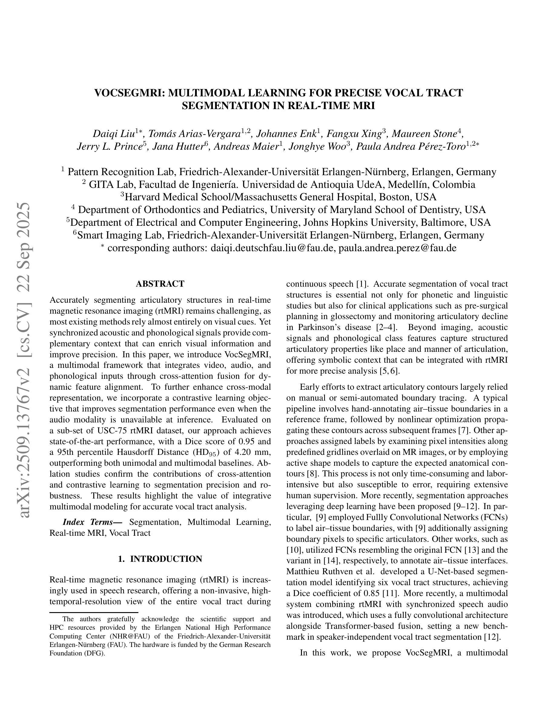 实时磁共振成像(rtMRI)中精确分割发音结构仍然是一个挑战,因为大多数现有方法几乎完全依赖于视觉线索。然而,同步的声学和语音信号提供了丰富的上下文信息,可以丰富视觉信息并提高精度。在本文中,我们介绍了VocSegMRI,这是一个多模式框架,通过跨注意融合整合视频、音频和语音输入,以实现动态特征对齐。为了进一步增强跨模式表示,我们采用了对比学习目标,即使在推理阶段音频模式不可用的情况下,也能提高分割性能。在USC-75 rtMRI数据集的一个子集上进行了评估,我们的方法达到了最先进的性能,Dice得分为0.95,95%百分位Hausdorff距离(HD_95)为4.20毫米,超过了单模态和多模态基线。消融研究证实了跨注意力和对比学习对分割精度和稳健性的贡献。这些结果突显了整合多模式建模在准确分析声带结构中的重要性。