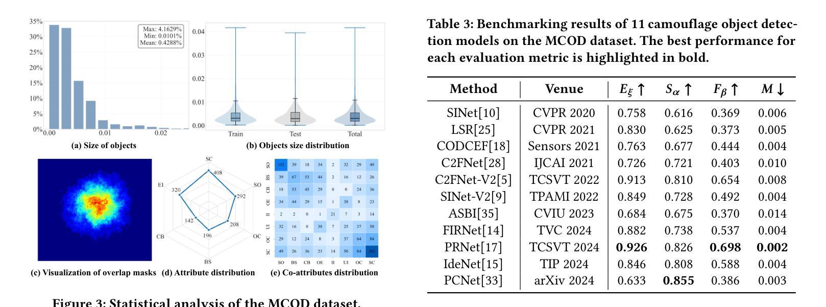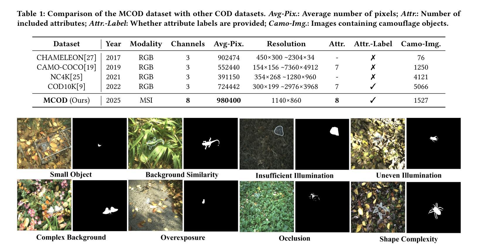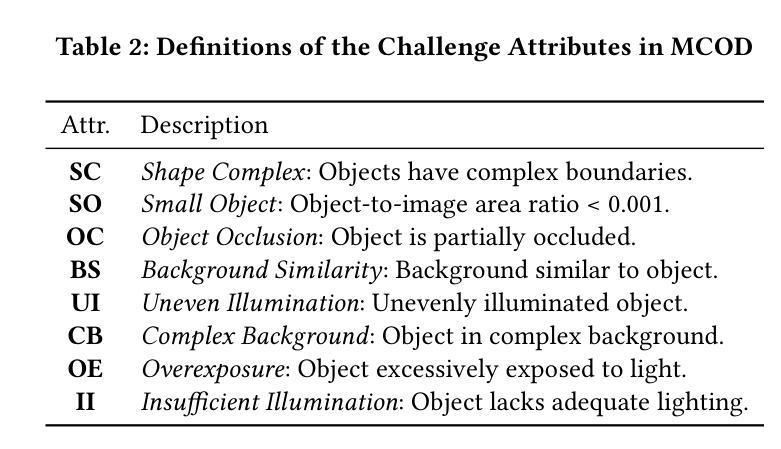 - MCOD数据集的特点包括全面的挑战属性、多样化的现实世界场景和高质量像素级别的标注。