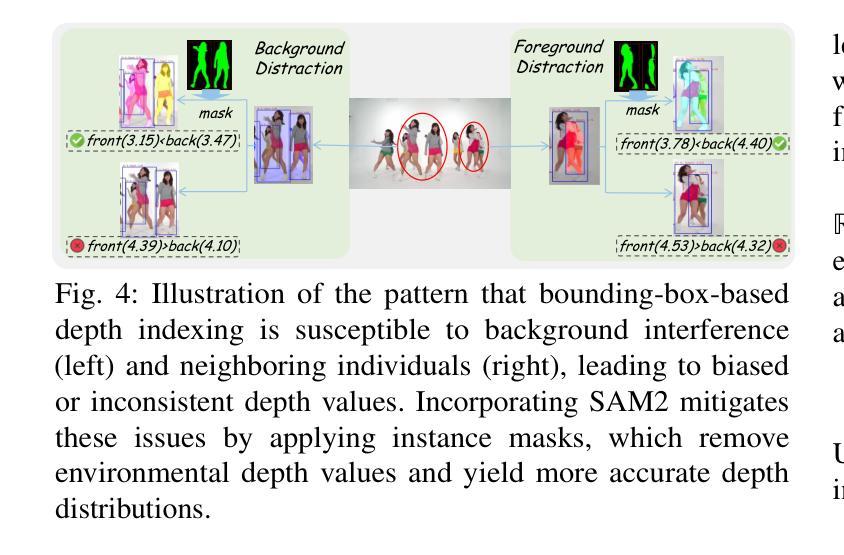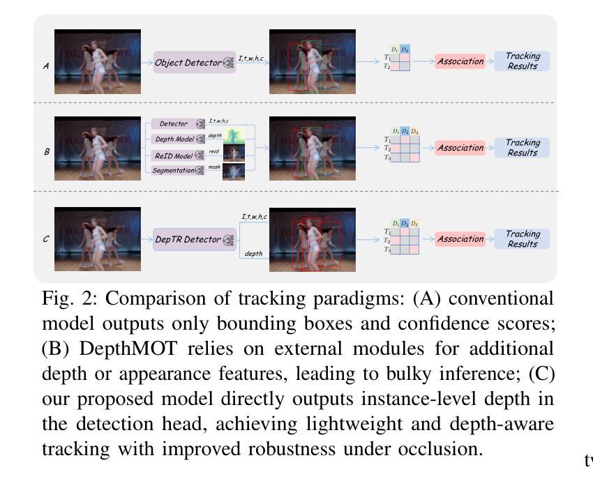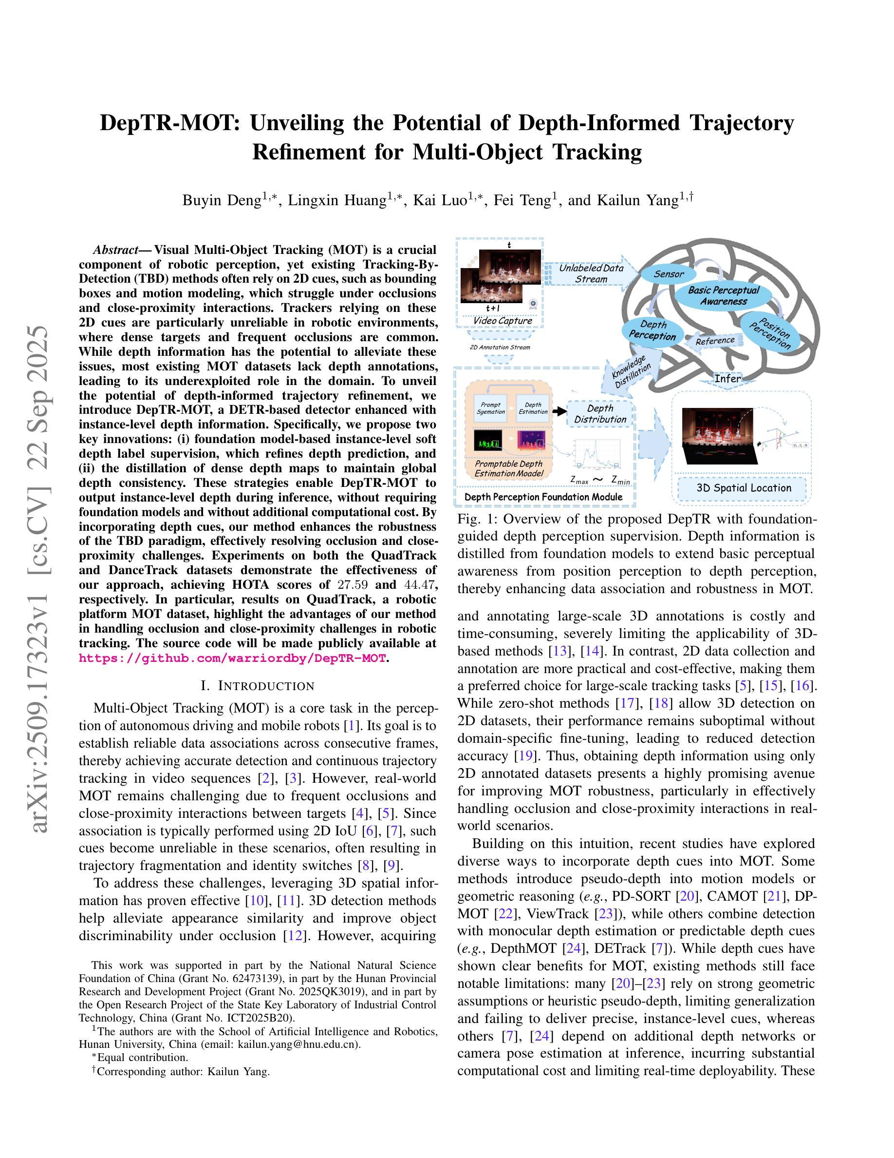 视觉多目标跟踪(MOT)是机器人感知的重要组成部分,但现有的跟踪检测(TBD)方法往往依赖于二维线索,如边界框和运动建模,这在遮挡和近距离交互的情况下存在困难。依赖这些二维线索的跟踪器在机器人环境中尤其不可靠,其中密集目标和频繁遮挡很常见。虽然深度信息有潜力解决这些问题,但大多数现有的MOT数据集缺乏深度注释,导致其在该领域的作用被低估。为了揭示深度信息轨迹修正的潜力,我们引入了DepTR-MOT,这是一个基于DETR的探测器,增强了实例级别的深度信息。具体来说,我们提出了两项关键创新:(i)基于基础模型的实例级软深度标签监督,这可以优化深度预测;(ii)密集深度图的蒸馏以保持全局深度一致性。这些策略使DepTR-MOT能够在推理过程中输出实例级别的深度,而无需基础模型且无需额外的计算成本。通过融入深度线索,我们的方法提高了TBD范式的稳健性,有效地解决了遮挡和近距离挑战。在QuadTrack和DanceTrack数据集上的实验证明了我们的方法的有效性,分别实现了HOTA分数为27.59和44.47。特别是在QuadTrack机器人平台MOT数据集上的结果,突显了我们的方法在机器人跟踪中处理遮挡和近距离挑战的优势。源代码将公开发布在https://github.com/warriordby/DepTR-MOT。