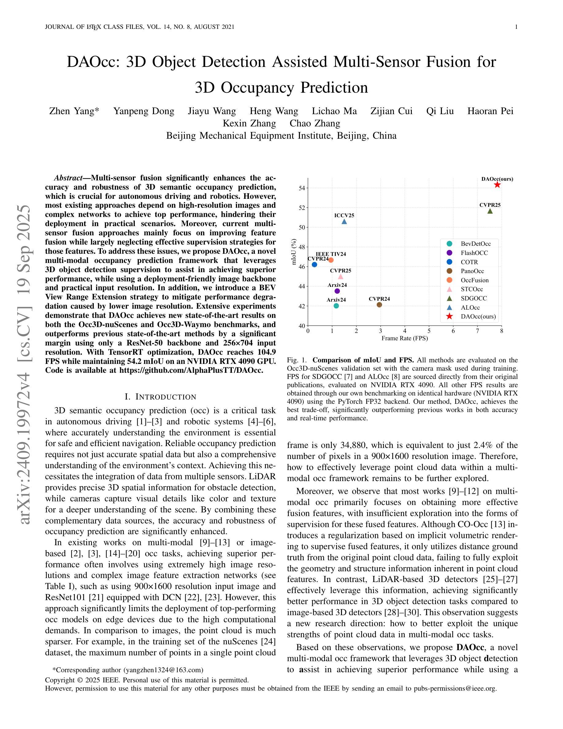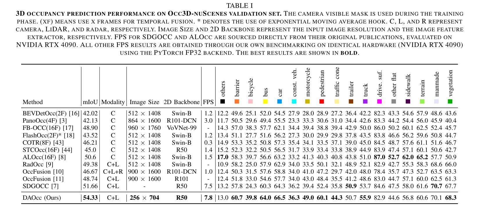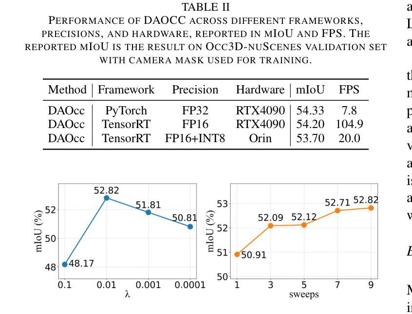 - DAOcc在NVIDIA RTX 4090 GPU上达到每秒104.9帧处理速度,同时保持高mIoU值。