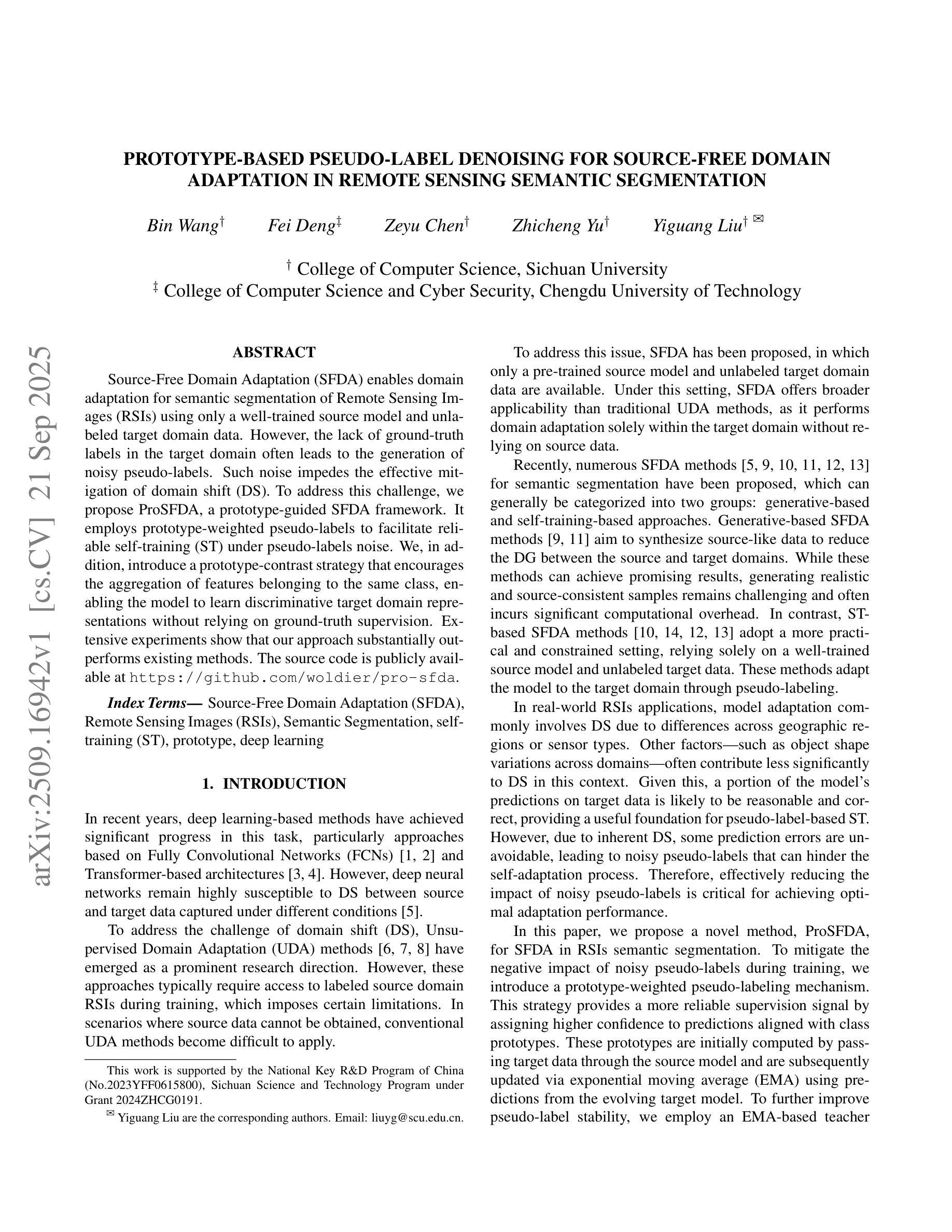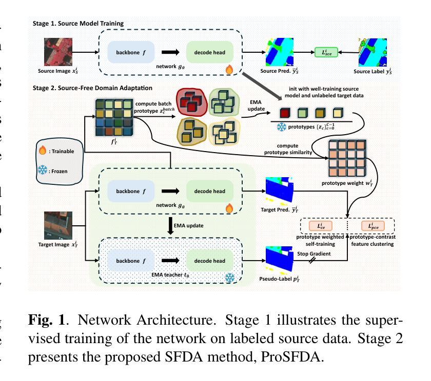 无源域自适应(SFDA)技术仅利用预先训练好的源模型和未标记的目标域数据,实现了遥感图像语义分割的域自适应。然而,目标域中缺乏真实标签通常会导致生成带有噪声的伪标签。这种噪声阻碍了域偏移(DS)的有效缓解。为了解决这一挑战,我们提出了ProSFDA,一种原型引导的无源域自适应(SFDA)框架。它采用原型加权伪标签,在伪标签噪声下实现可靠的自训练(ST)。此外,我们还引入了一种原型对比策略,该策略鼓励属于同一类的特征进行聚合,使模型能够在不依赖真实标签监督的情况下,学习具有区分度的目标域表示。大量实验表明,我们的方法显著优于现有方法。