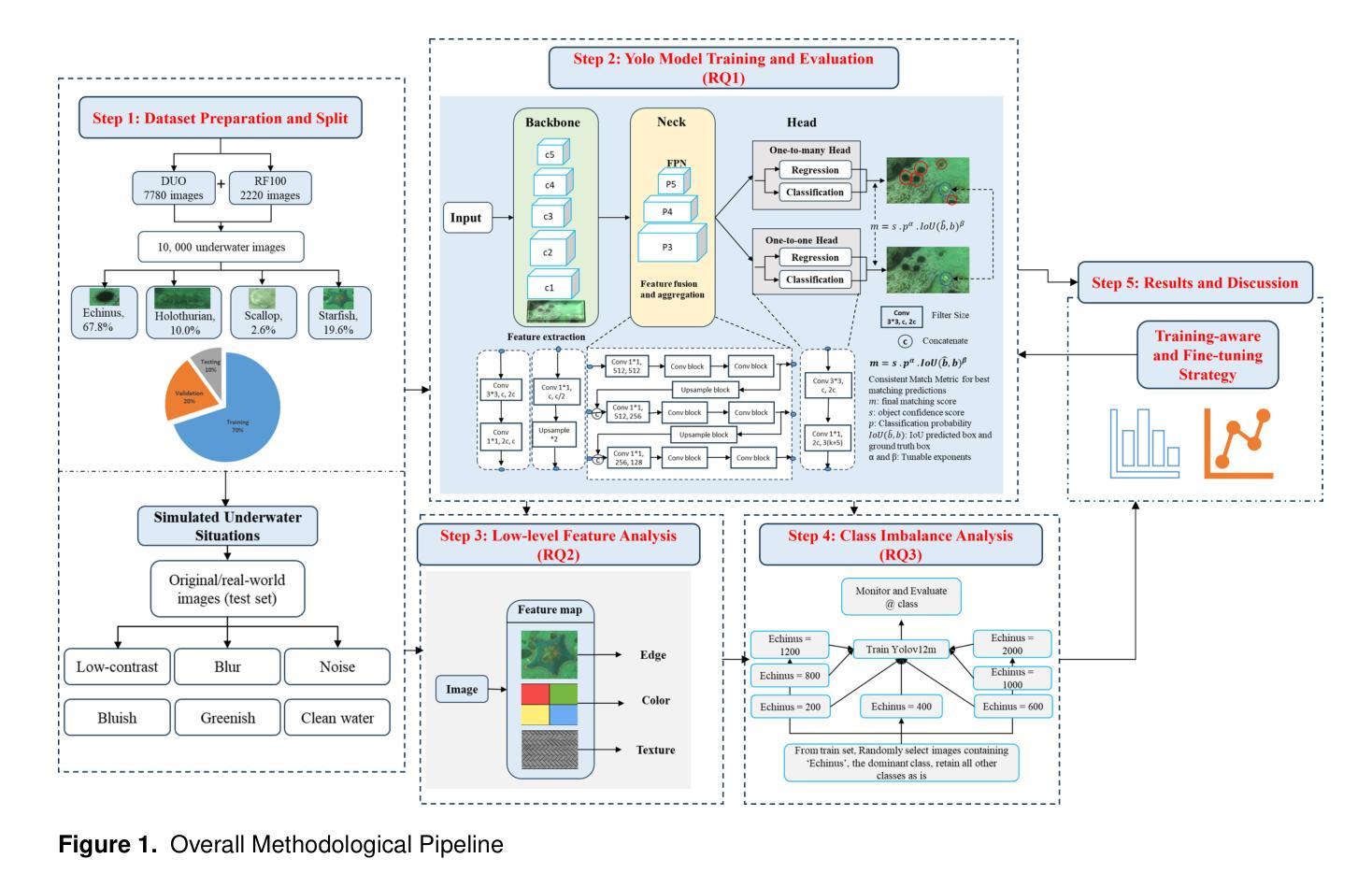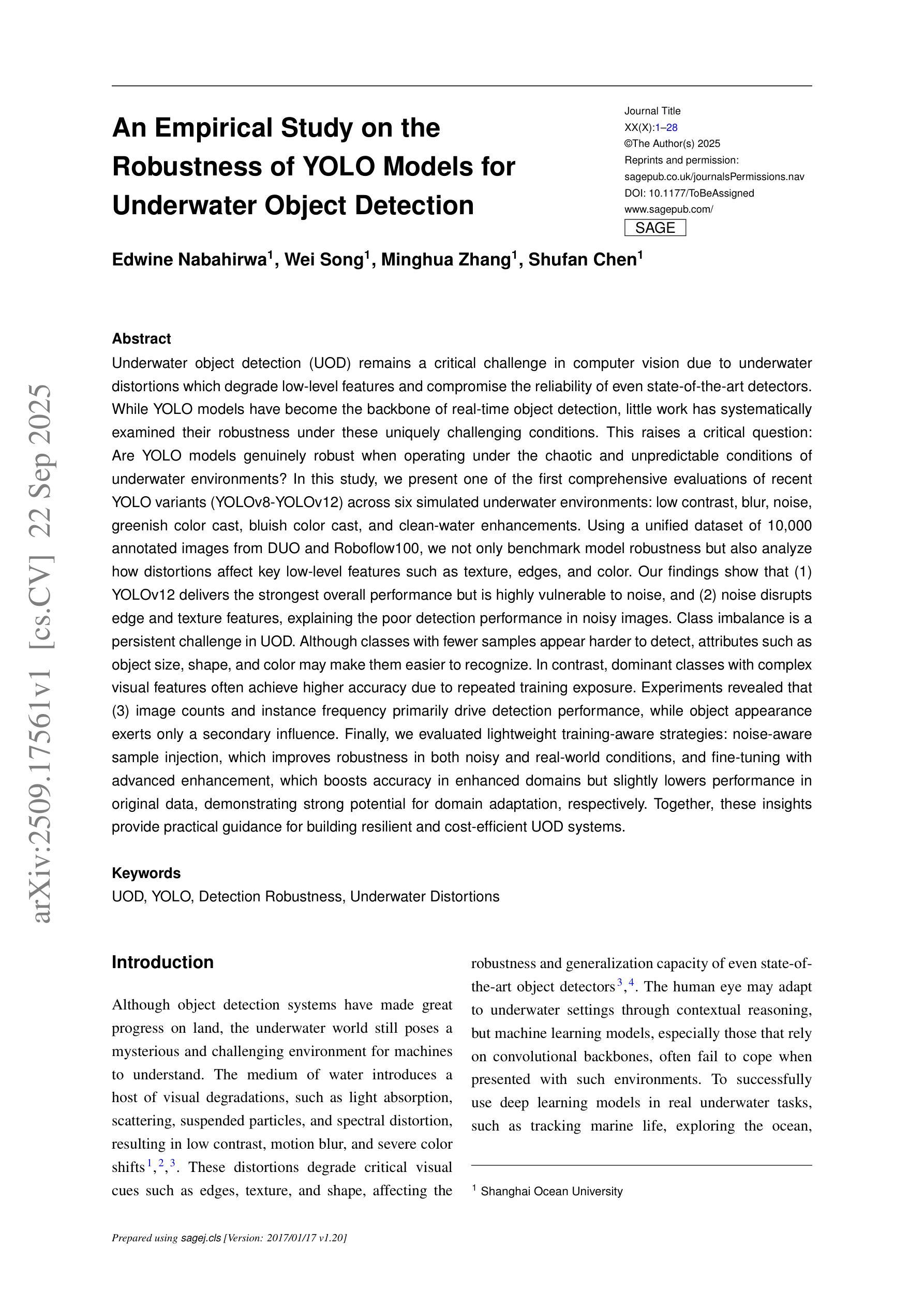 本文研究了水下目标检测(UOD)的挑战性问题,探讨了YOLO模型在水下环境中的稳健性。研究通过对YOLO的不同变体(YOLOv8至YOLOv12)在六个模拟水下环境中的综合评估,发现YOLOv12整体性能最佳但易受噪声影响。同时,研究分析了水下失真对纹理、边缘和颜色等关键低层次特征的影响。此外,实验表明图像数量和实例频率对检测性能有主要影响,而物体外观的影响较小。最后,研究评估了轻量级训练感知策略,如噪声感知样本注入和高级增强微调等,为提高水下目标检测的鲁棒性和效率提供了实际指导。