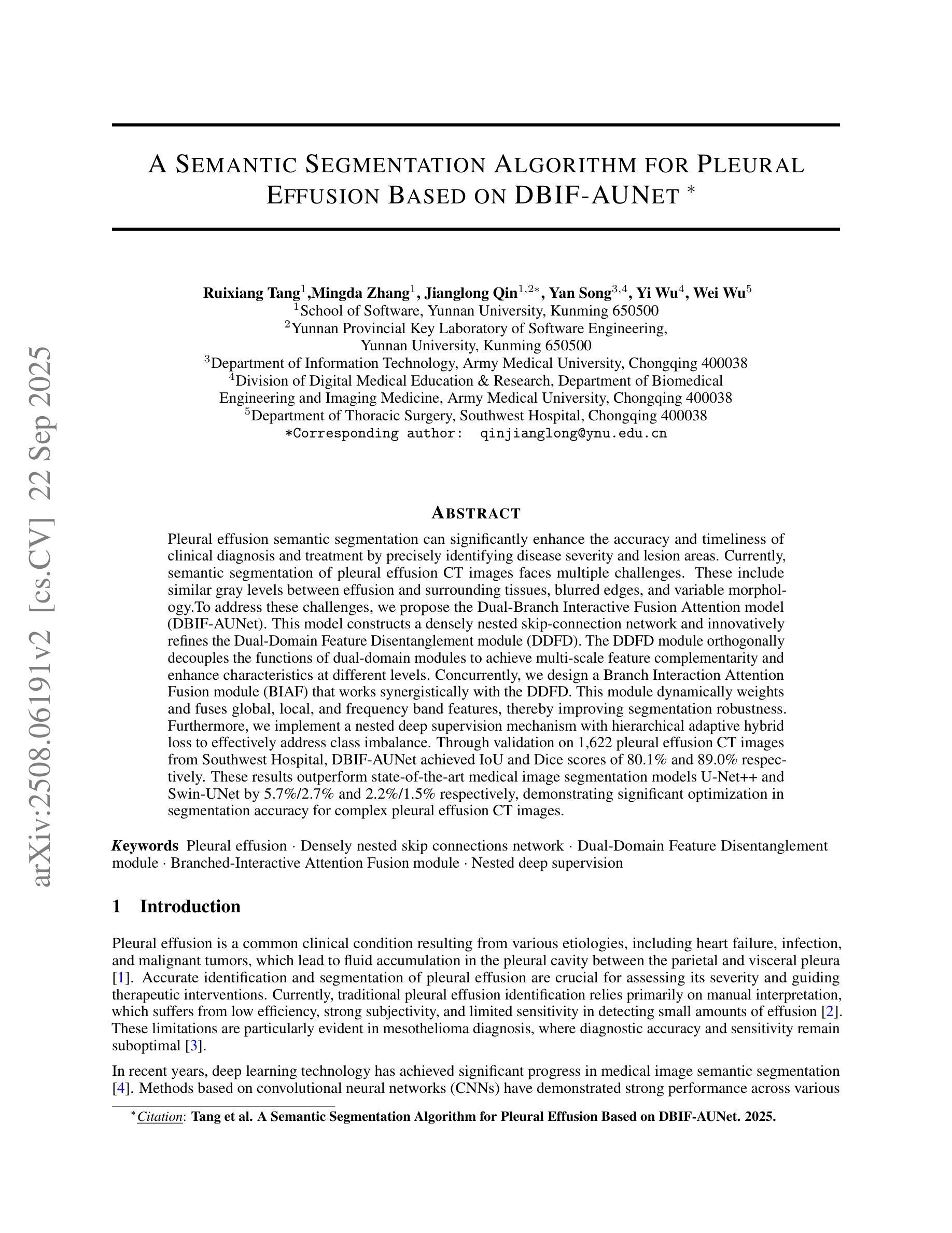 胸膜积液语义分割能够精确识别疾病严重程度和病灶区域,从而提高临床诊断和治疗准确性和及时性。针对胸膜积液CT图像语义分割所面临的挑战,如灰度相似、边缘模糊和形态多变等问题,我们提出了双分支交互融合注意力模型(DBIF-AUNet)。该模型通过改进特征分解和融合方式,实现了多尺度特征互补和不同层次特征增强。在西南医院的1622张胸膜积液CT图像上进行验证,DBIF-AUNet的IoU和Dice得分分别为80.1%和89.0%,较其他先进医学图像分割模型有显著提高。