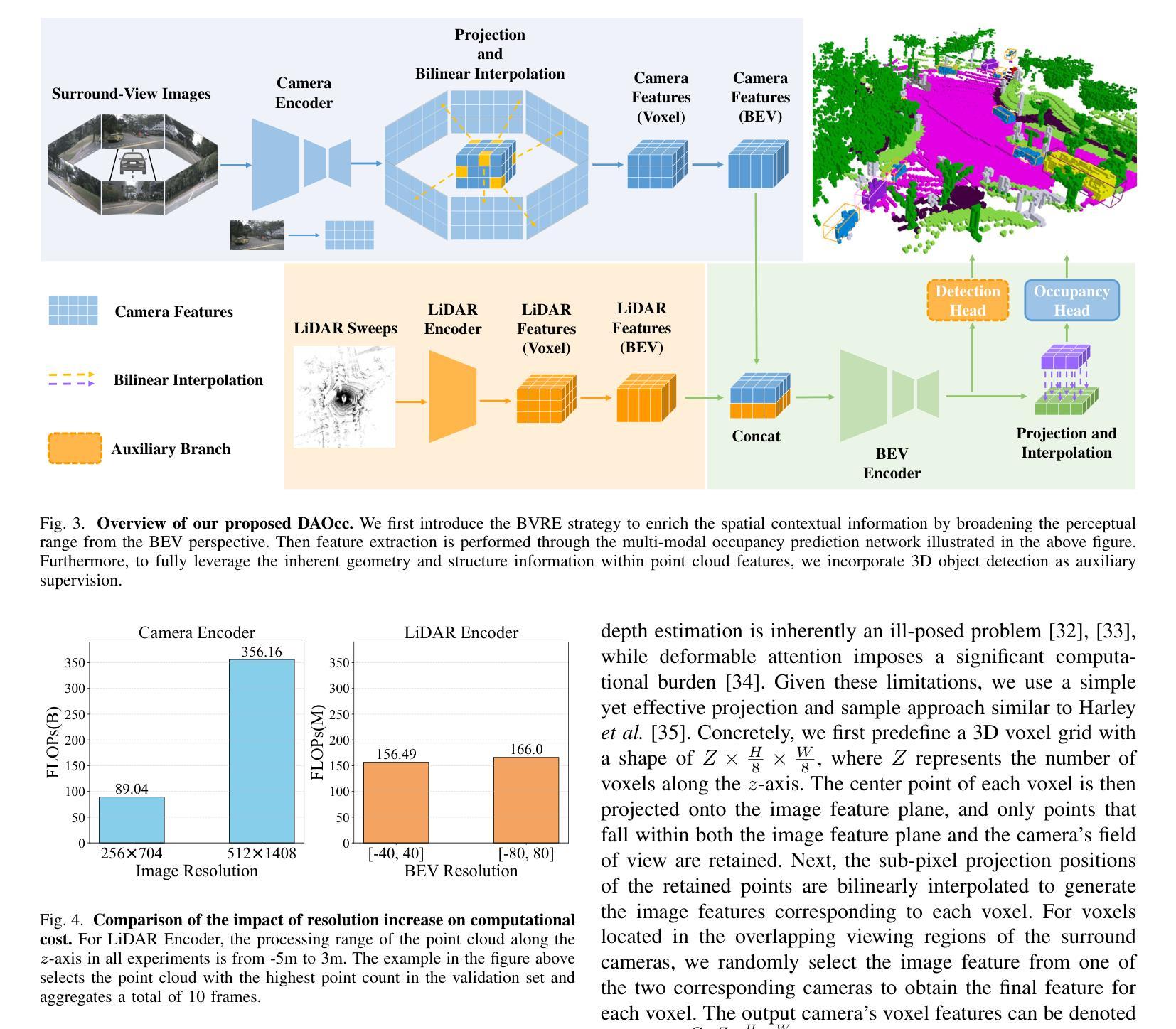 多传感器融合能提高三维语义占用预测的准确性及鲁棒性,对自动驾驶和机器人技术至关重要。但现有方法依赖高分辨率图像和复杂网络实现最佳性能,阻碍了实际应用场景的部署。为解决这个问题,我们提出了DAOcc框架,利用三维物体检测的监控帮助获得卓越性能,同时采用部署友好的图像骨干网及实用输入分辨率。实验表明,DAOcc在Occ3D-nuScenes和Occ3D-Waymo两个基准测试上都达到最新技术水平,仅使用ResNet-50骨干网和256*704输入分辨率便大幅超越先前技术。经TensorRT优化后,DAOcc在NVIDIA RTX 4090 GPU上达到每秒104.9帧的处理速度,同时保持54.2 mIoU。
