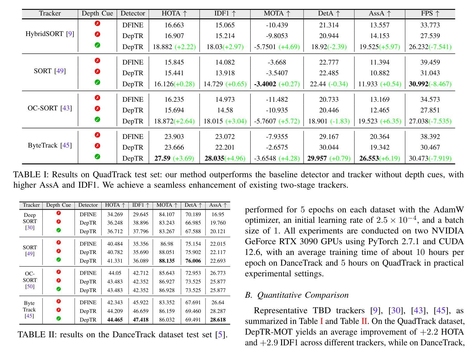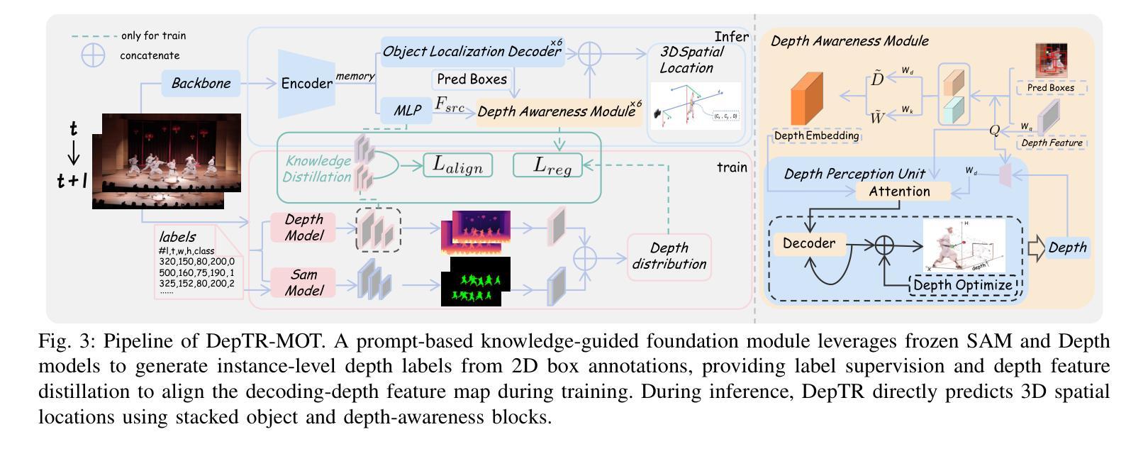 - DepTR-MOT是一种基于DETR的检测器,引入了实例级深度信息来提升轨迹精细度。其两大关键创新为基础模型辅助的实例级软深度标签监督和用于维持全局深度一致性的深度图蒸馏方法。