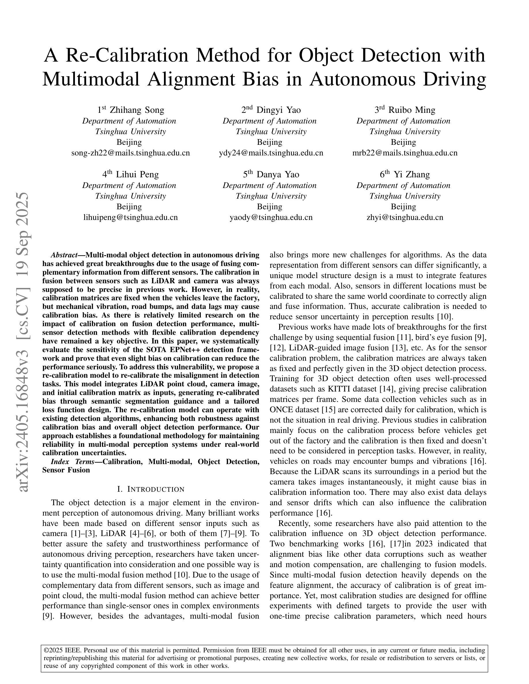 本文探讨了自主驾驶中多模态物体检测的突破,特别是在融合不同传感器信息方面的应用。由于车辆出厂时校准矩阵是固定的,但现实环境中的机械振动、路面颠簸和数据延迟可能导致校准偏差。针对现有研究中关于校准对融合检测性能影响的研究相对有限,本文系统地评估了当前先进的EPNet++检测框架的敏感性,并提出了一种重新校准模型来解决检测任务中的不对齐问题。该模型通过语义分割指导和定制的损失函数设计,将激光雷达点云、相机图像和初始校准矩阵作为输入,生成重新校准的偏差。重新校准模型可以与现有的检测算法一起操作,增强了对抗校准偏差的鲁棒性和整体物体检测性能。本文的方法为现实世界中校准不确定性下的多模态感知系统保持可靠性建立了基础方法。