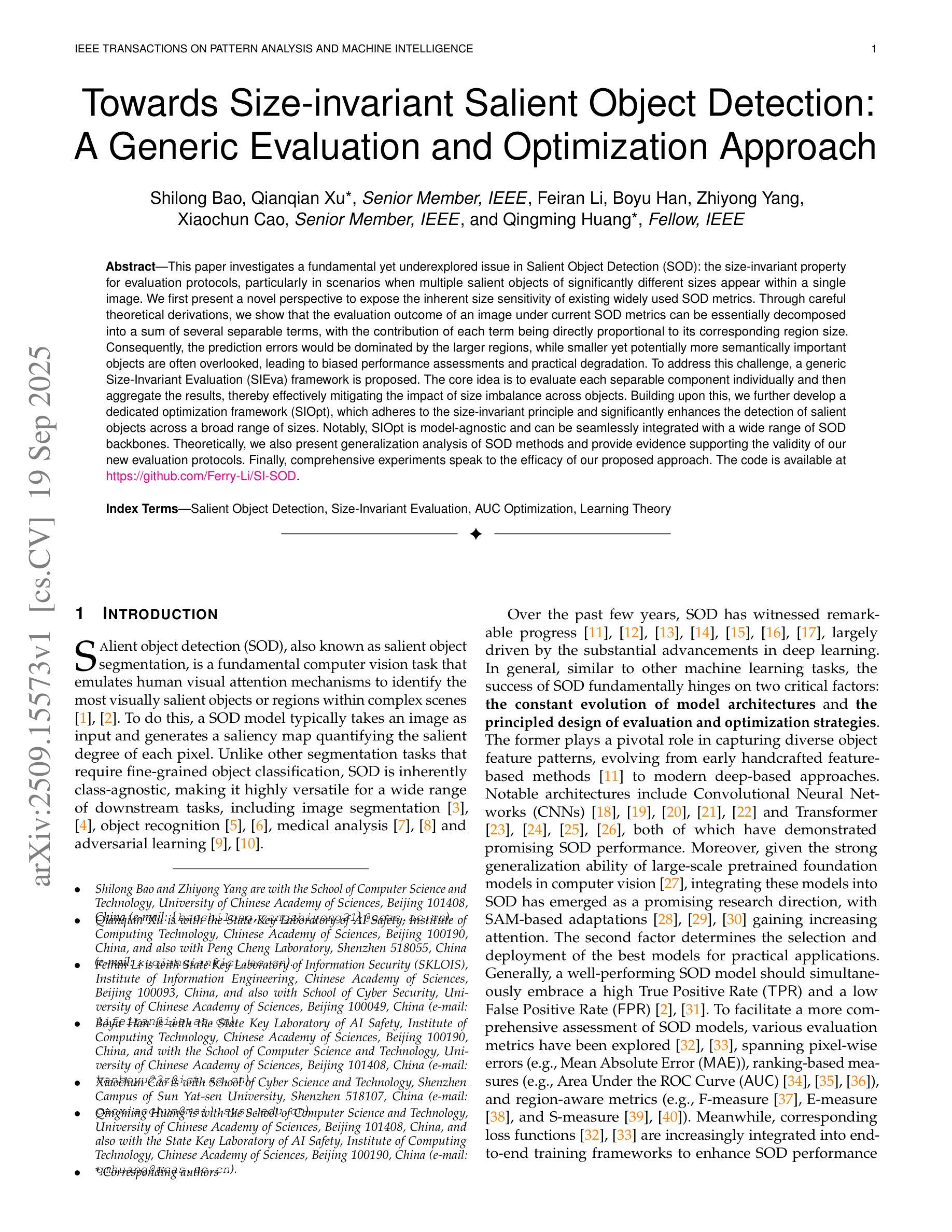 本文探讨了显著目标检测(SOD)中一个基础但尚未被充分研究的问题:评估协议中的尺寸不变性,特别是在单个图像中出现多个大小显著不同的目标时的场景。文章首先提出一种新的视角来揭示现有广泛使用的SOD指标固有的尺寸敏感性。通过仔细的理论推导,文章表明当前SOD指标下的图像评估结果可以分解为几个可分离项的和,每个项的贡献与其相应区域的大小直接成比例。因此,预测误差主要由较大的区域主导,而较小但可能更具语义重要性的对象往往被忽视,导致性能评估偏差和实际性能下降。为解决此问题,文章提出了通用的尺寸不变评估(SIEva)框架。核心思想是对每个可分离组件进行个别评估,然后汇总结果,从而有效缓解对象之间尺寸不平衡的影响。在此基础上,文章进一步开发了一个专用的优化框架(SIOpt),它遵循尺寸不变原则,并显著提高了各种尺寸下显著目标的检测效果。值得注意的是,SIOpt与模型无关,可以无缝集成到广泛的SOD主干网络中。最后,大量的实验验证了所提出方法的有效性。