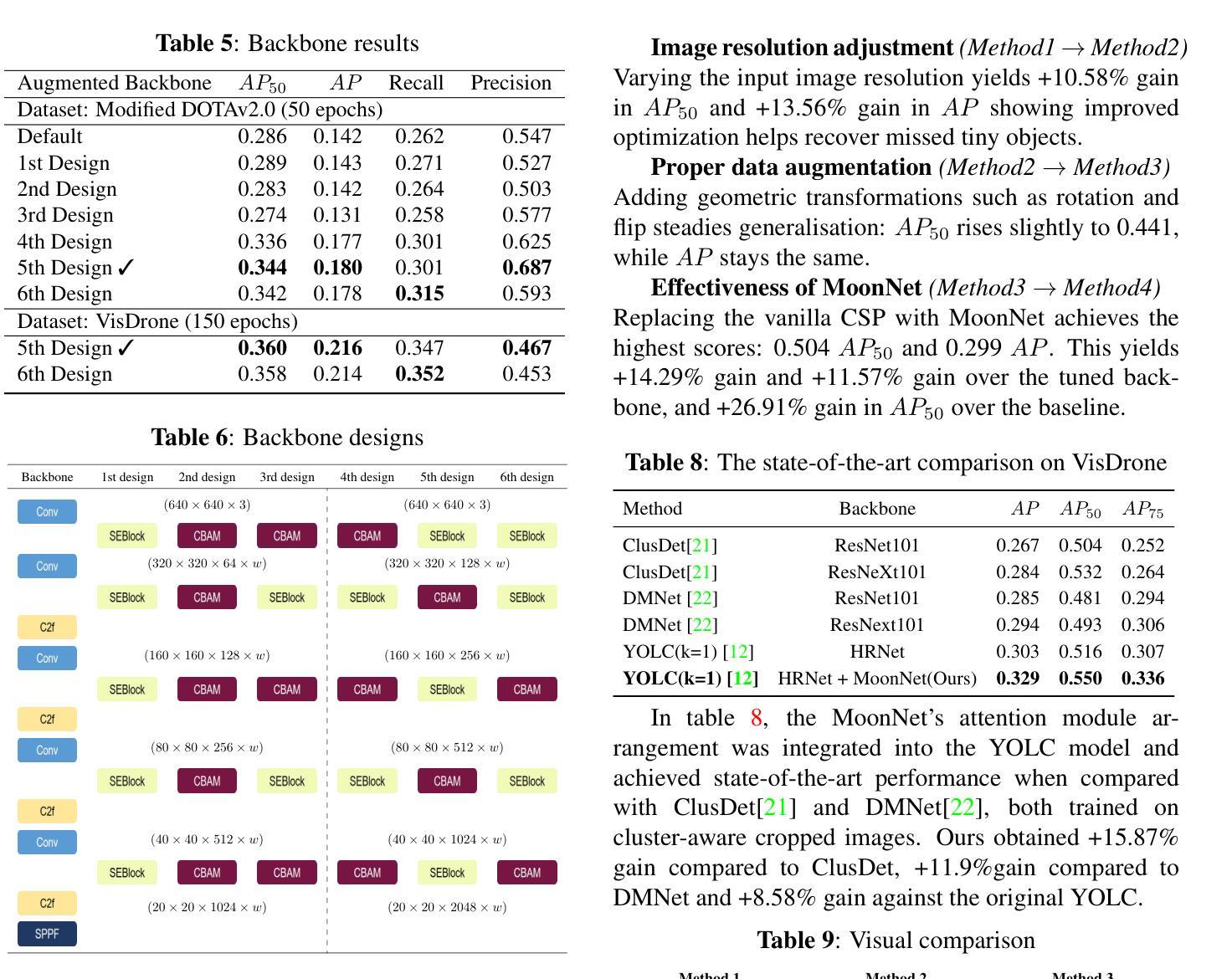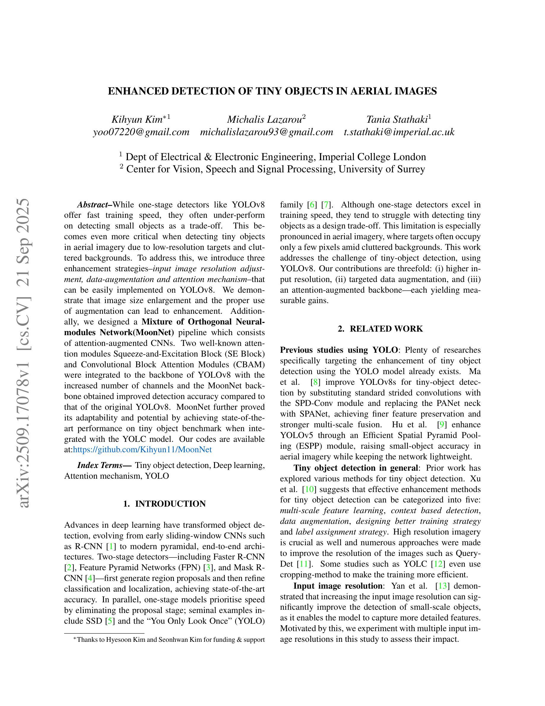 尽管像YOLOv8这样的单阶段检测器提供了快速的训练速度,但它们往往在检测小物体时表现不佳。这在检测空中图像中的微小物体时变得尤为关键,因为目标分辨率低且背景杂乱。为了解决这个问题,我们引入了三种增强策略,即输入图像分辨率调整、数据增强和注意力机制,这些策略可以很容易地在YOLOv8上实现。我们证明,图像尺寸放大和适当的增强可以导致性能提升。此外,我们设计了一个混合正交神经网络(MoonNet)管道,它由增强注意力的卷积神经网络组成。我们整合了两个知名的注意力模块,即挤压-激发块(SE块)和卷积块注意力模块(CBAM),增加了YOLOv8的通道数,并且与原始YOLOv8相比,MoonNet骨干网在检测精度上有所提高。当与YOLC模型集成时,MoonNet在微小物体基准测试上达到了最先进的性能,进一步证明了其适应性和潜力。我们的代码可在:https://github.com/Kihyun11/MoonNet找到。