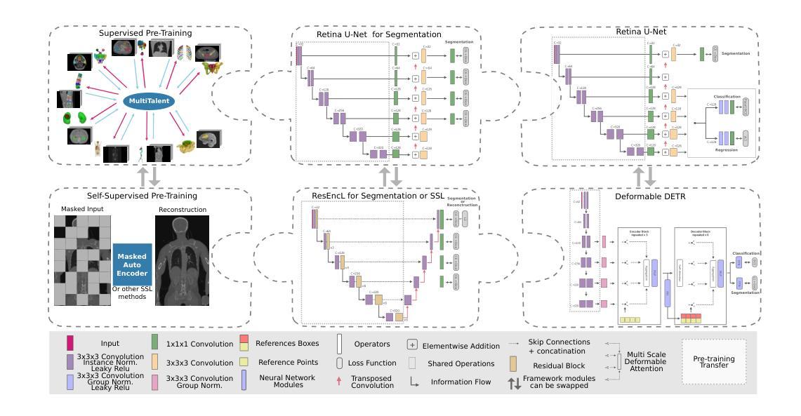 大规模预训练有望推动三维医学目标检测的发展,这是实现计算机辅助诊断准确性的关键部分。然而,与分割相比,预训练的研究仍然远远不够深入,在分割领域,预训练已经显示出显著的益处。现有的三维目标检测预训练方法依赖于二维医学数据或自然图像预训练,未能充分利用三维体积信息。在这项工作中,我们首次系统地研究了如何将现有预训练方法集成到最先进的检测架构中,涵盖卷积神经网络和Transformer。我们的结果表明,预训练在各种任务和数据集上始终提高了检测性能。值得注意的是,基于重建的自我监督预训练优于监督预训练,而对比预训练对于三维医学目标检测没有明确的优势。我们的代码公开在:[https://github.com/MIC-DKFZ/nnDetection-finetuning。]