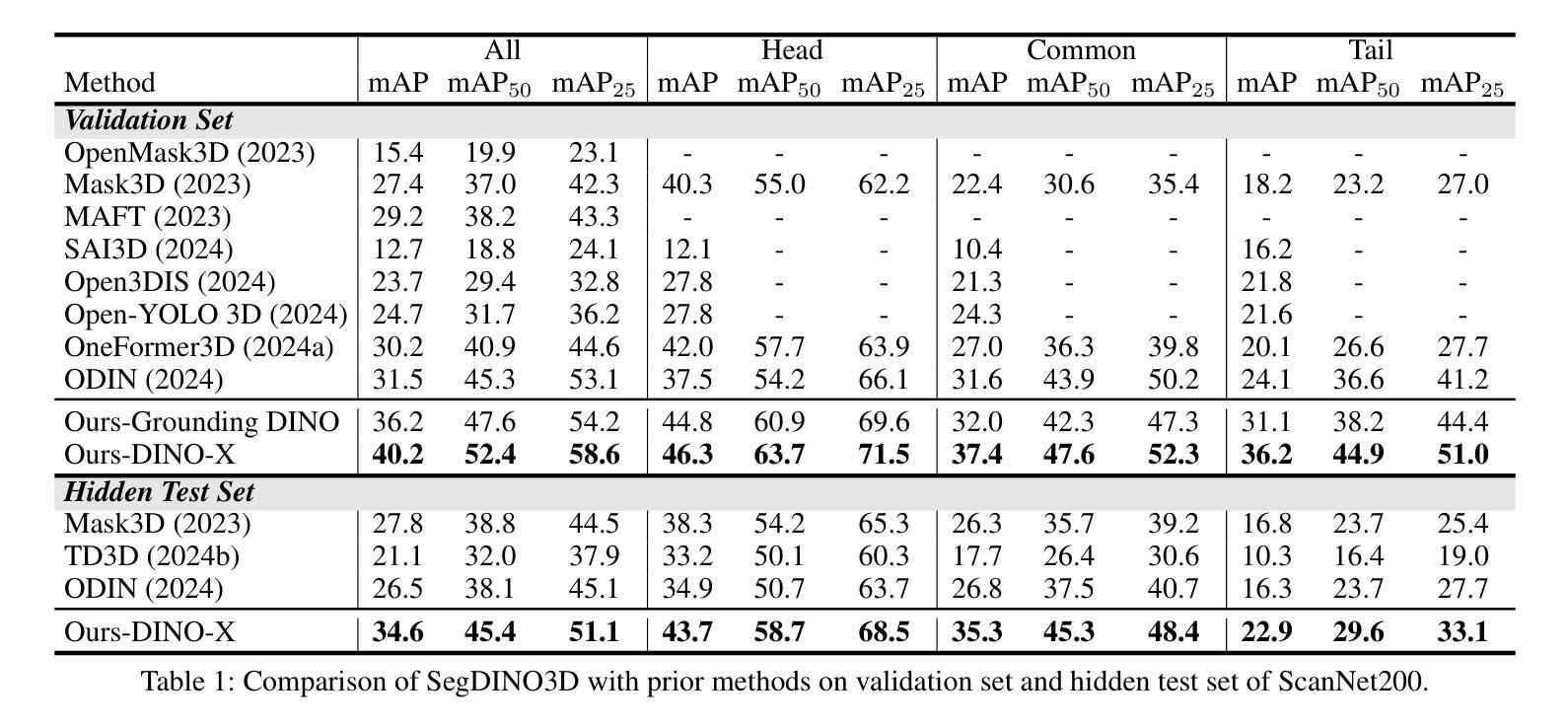 SegDINO3D是一个用于三维实例分割的新型Transformer编码器-解码器框架。它充分利用二维检测模型的图像级和对象级特征来提高三维表现。框架接受点云和相关的二维图像作为输入,将每个三维点丰富与来自相应图像视图的二维图像特征,并通过三维编码器进行三维上下文融合。解码阶段制定了三维对象查询作为三维锚箱,并从三维查询到二维对象查询执行交叉注意力,使用二维检测模型从二维图像中获取这些查询。SegDINO3D在ScanNetV2和ScanNet200三维实例分割基准测试中取得了最先进的性能,尤其在具有挑战性的ScanNet200数据集上表现出显著优势。