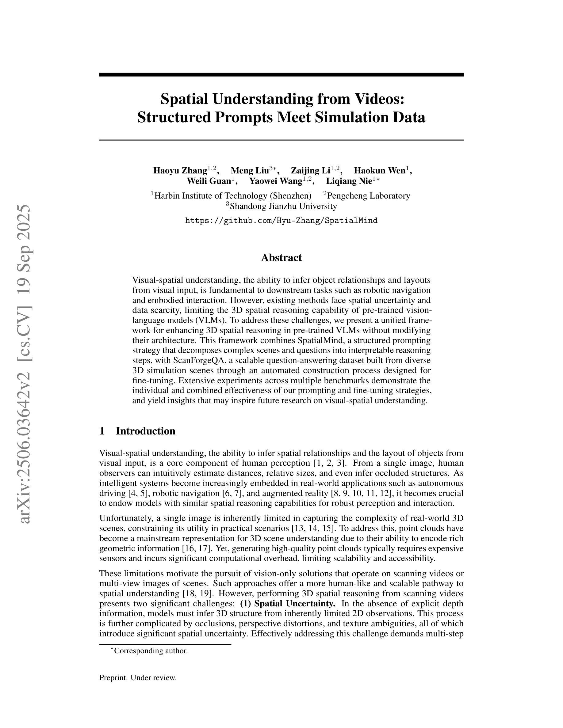 视觉空间理解,即从视觉输入推断物体关系和布局的能力,对于下游任务如机器人导航和实体交互至关重要。然而,现有方法面临空间不确定性和数据稀缺性问题,限制了预训练视觉语言模型(VLM)的3D空间推理能力。为了解决这些挑战,我们提出了一种无需修改架构即可提高预训练VLM中3D空间推理的统一框架。该框架结合了SpatialMind(一种结构化提示策略,可将复杂场景和问题分解为可解释的推理步骤)和ScanForgeQA(一个可扩展的问答数据集,通过专为微调设计的自动化构建流程,从多样化的3D模拟场景中构建)。在多个基准测试上的广泛实验证明了我们的提示和微调策略单独和联合使用的有效性,并产生了对未来视觉空间理解研究的启示。