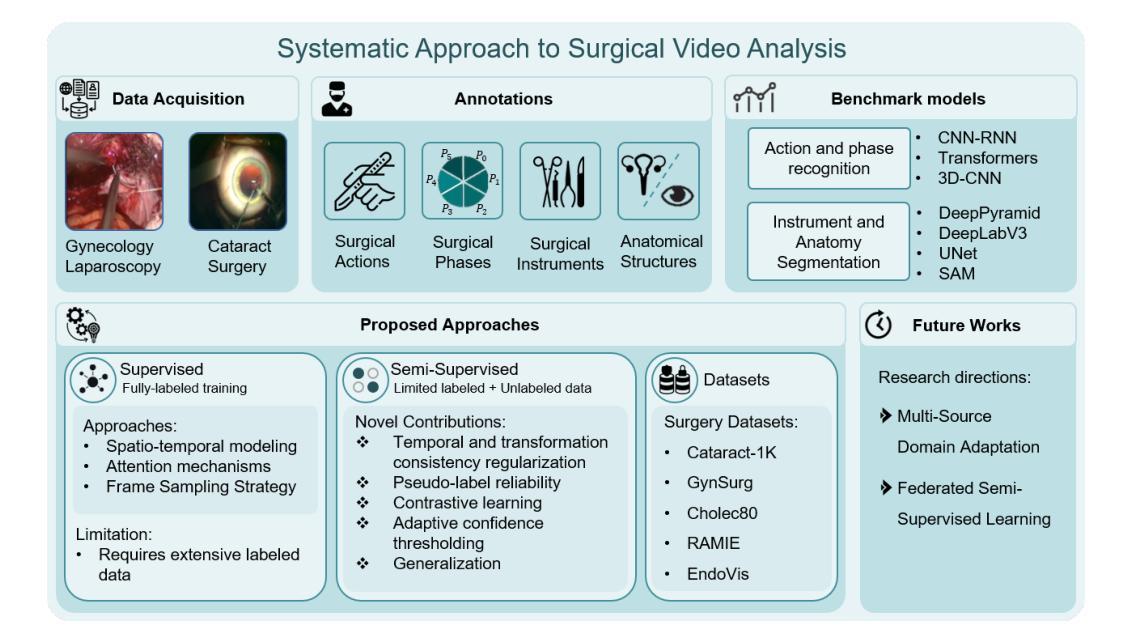 Advances in surgical video analysis are transforming operating rooms into intelligent, data-driven environments. Computer-assisted systems support full surgical workflow, from preoperative planning to intraoperative guidance and postoperative assessment. However, developing robust and generalizable models for surgical video understanding remains challenging due to (I) annotation scarcity, (II) spatiotemporal complexity, and (III) domain gap across procedures and institutions. This doctoral research aims to bridge the gap between deep learning-based surgical video analysis in research and its real-world clinical deployment. To address the core challenge of recognizing surgical phases, actions, and events, critical for analysis, I benchmarked state-of-the-art neural network architectures to identify the most effective designs for each task. I further improved performance by proposing novel architectures and integrating advanced modules. Given the high cost of expert annotations and the domain gap across surgical video sources, I focused on reducing reliance on labeled data. We developed semi-supervised frameworks that improve model performance across tasks by leveraging large amounts of unlabeled surgical video. We introduced novel semi-supervised frameworks, including DIST, SemiVT-Surge, and ENCORE, that achieved state-of-the-art results on challenging surgical datasets by leveraging minimal labeled data and enhancing model training through dynamic pseudo-labeling. To support reproducibility and advance the field, we released two multi-task datasets: GynSurg, the largest gynecologic laparoscopy dataset, and Cataract-1K, the largest cataract surgery video dataset. Together, this work contributes to robust, data-efficient, and clinically scalable solutions for surgical video analysis, laying the foundation for generalizable AI systems that can meaningfully impact surgical care and training.