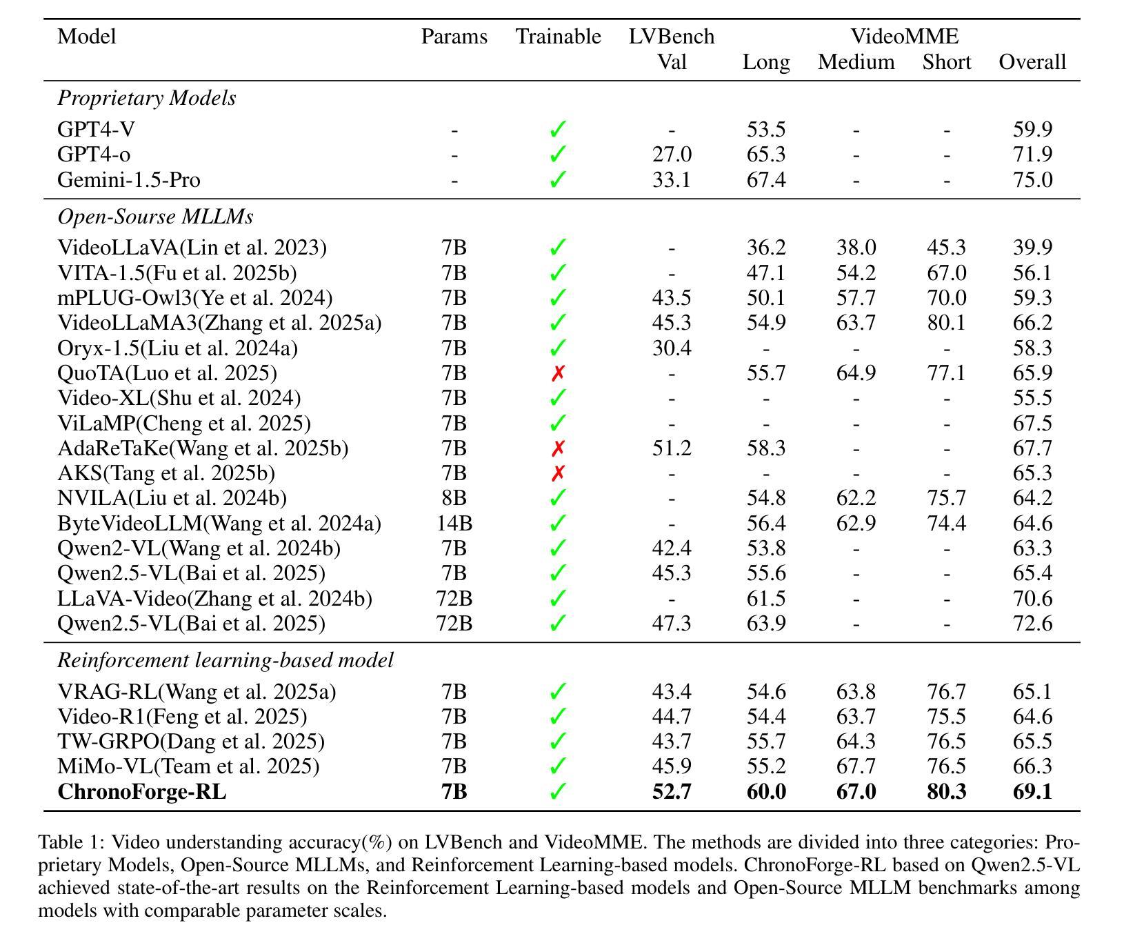 - ChronoForge-RL框架在VideoMME和LVBench上表现出优异性能,超过基线方法,实现与大型模型相近的性能水平。