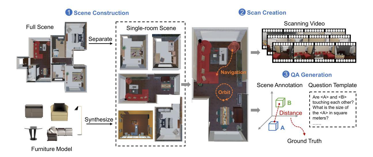 - ScanForgeQA是一个通过自动化构建过程从多样化的三维模拟场景中构建的大规模问答数据集。