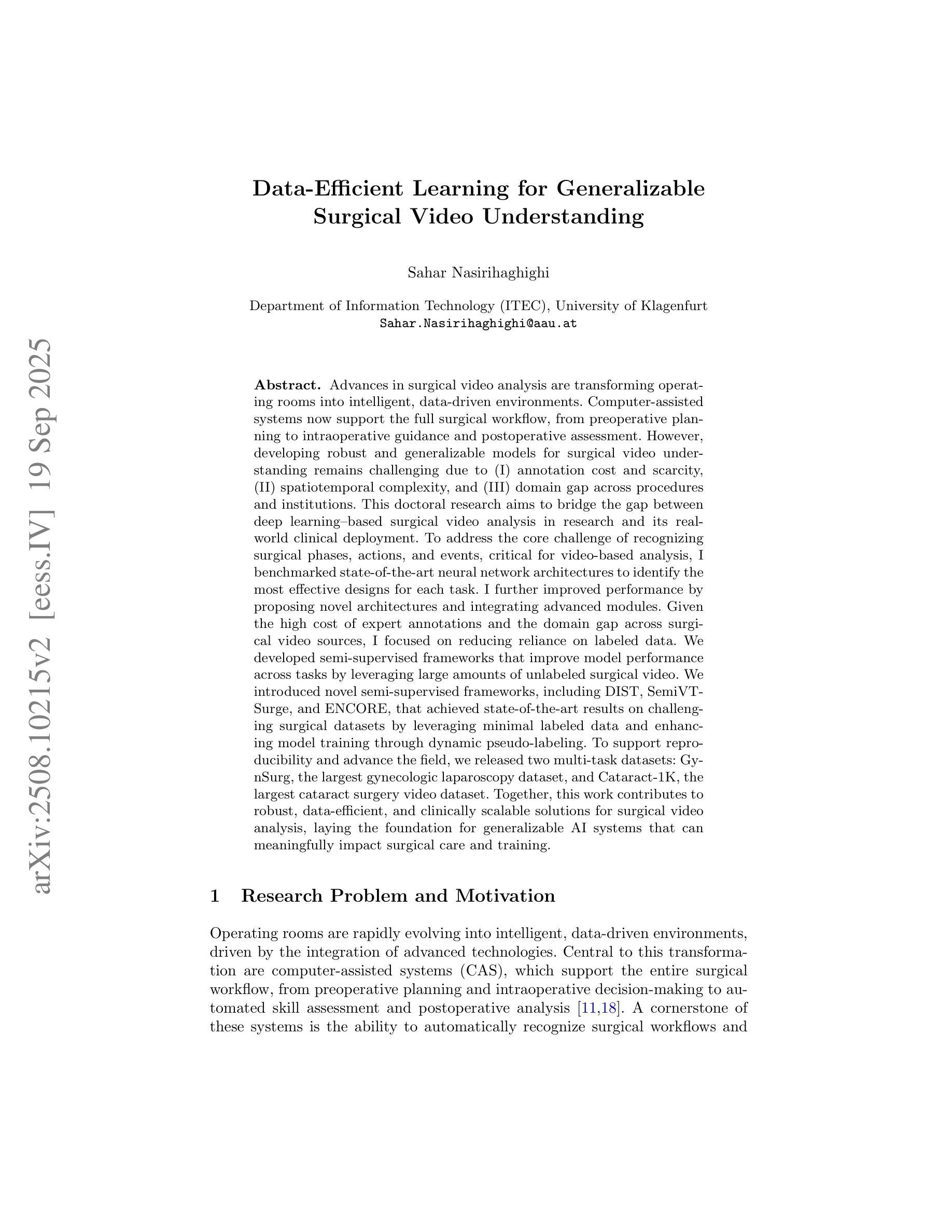手术视频分析技术的进步正在将手术室转变为智能、数据驱动的环境。计算机辅助系统支持从术前规划到术中指导和术后评估的完整手术工作流程。然而,由于(I)标注数据稀缺,(II)时空复杂性,以及(III)不同手术和机构之间的领域差异,为手术视频理解开发稳健和可推广的模型仍然具有挑战性。本博士研究旨在缩小基于深度学习的手术视频分析研究与其现实临床应用之间的差距。为了解决识别手术阶段、动作和事件的核心挑战,这些对分析至关重要,我对最先进神经网络架构进行了基准测试,以确定每项任务最有效的设计。通过提出新型架构和集成先进模块,我进一步提高了性能。考虑到专家标注的高成本和不同手术视频来源的域差异,我重点关注减少对有标签数据的依赖。我们开发了半监督框架,通过利用大量未标注手术视频来提高各项任务的模型性能。我们介绍了新型半监督框架,包括DIST、SemiVT-Surge和ENCORE,这些框架在具有挑战性的手术数据集上实现了最佳结果,通过利用少量有标签数据和通过动态伪标签增强模型训练。为了支持重复实验并推动该领域的发展,我们发布了两个多任务数据集:GynSurg(最大的妇科腹腔镜数据集)和Cataract-1K(最大的白内障手术视频数据集)。总体而言,这项工作为手术视频分析提供了稳健、数据高效和临床可扩展的解决方案,为可推广的人工智能系统奠定了基础,这些系统可以对手术护理和培训产生有意义的影响。