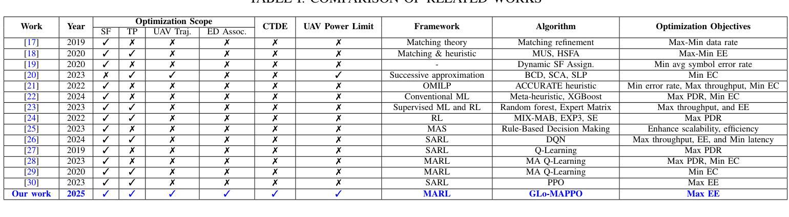 基于长程(LoRa)的低功耗广域网(LPWANs)因其长距离、低功耗、低成本的特点,在5G/6G生态系统中为下一代物联网(NG-IoT)应用至关重要。然而,在这种网络中实现高能效仍然是一个关键问题,特别是在大规模或动态变化的环境中。传统的地面LoRa部署往往存在覆盖缺口和非直视(NLoS)传播损失,而基于卫星的物联网解决方案消耗大量能源并引入高延迟,这限制了它们在能源受限和延迟敏感应用中的适用性。为了解决这些局限性,我们提出了一种使用多架无人机作为飞行LoRa网关的新型架构,以动态地从地面LoRa终端设备收集数据。我们的方法旨在通过联合优化扩频因子、传输功率、无人机轨迹和终端设备关联来最大化系统的加权全局能效。此外,我们将这个复杂的优化问题制定为部分可观察马尔可夫决策过程(POMDP),并提出绿色LoRa多智能体近端策略优化(GLo-MAPPO),这是一个基于集中训练与分散执行(CTDE)的多智能体强化学习(MARL)框架。仿真结果表明,GLo-MAPPO显著优于基准算法,在拥有10、20、30、40和50个LoRa终端设备的网络中,能效分别提高了71.25%、18.56%、67.00%、59.73%和49.95%。