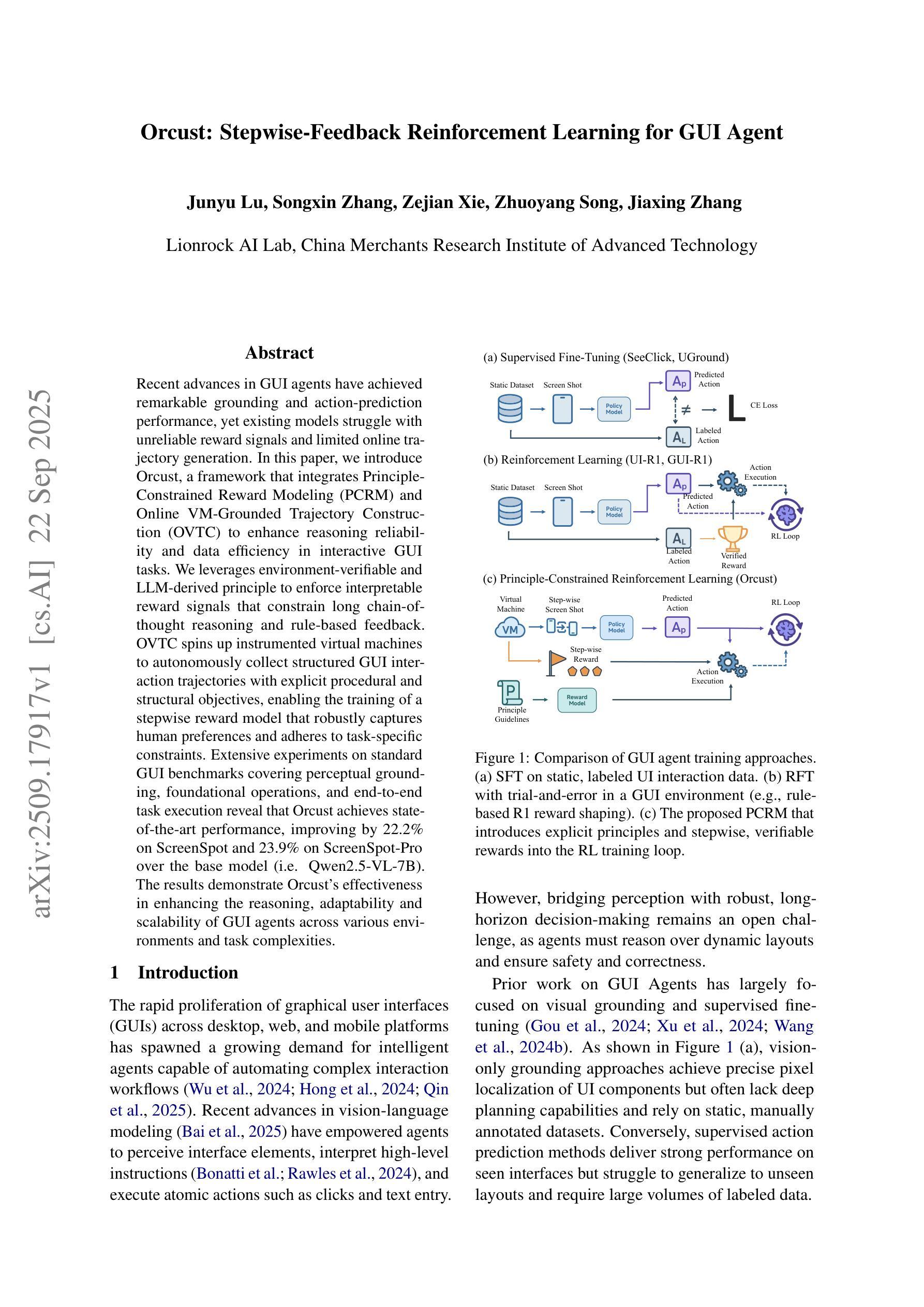 近期图形用户界面(GUI)代理的进展已经实现了显著的地标定位和动作预测性能。然而,现有模型在不可靠的奖励信号和有限的在线轨迹生成方面仍存在挑战。在本文中,我们介绍了Orcust框架,它结合了原则约束奖励建模(PCRM)和在线VM基地标轨迹构建(OVTC),以提高交互式GUI任务中的推理可靠性和数据效率。我们利用环境可验证和LLM派生的原则来实施可解释的奖励信号,约束长链思维推理和基于规则的反馈。OVTC启动仪器化虚拟机,以自主收集具有明确程序和结构目标的结构化GUI交互轨迹,从而训练分步奖励模型,稳健地捕捉人类偏好并遵守特定任务的约束。在涵盖感知定位、基础操作和端到端任务执行的标准GUI基准测试上的大量实验表明,Orcust达到了最先进的性能,在ScreenSpot和ScreenSpot-Pro上的性能较基础模型分别提高了22.2%和23.9%(即Qwen2.5-VL-7B)。结果证明了Orcust在增强GUI代理的推理、适应性和可伸缩性方面的有效性,适用于各种环境和任务复杂性。