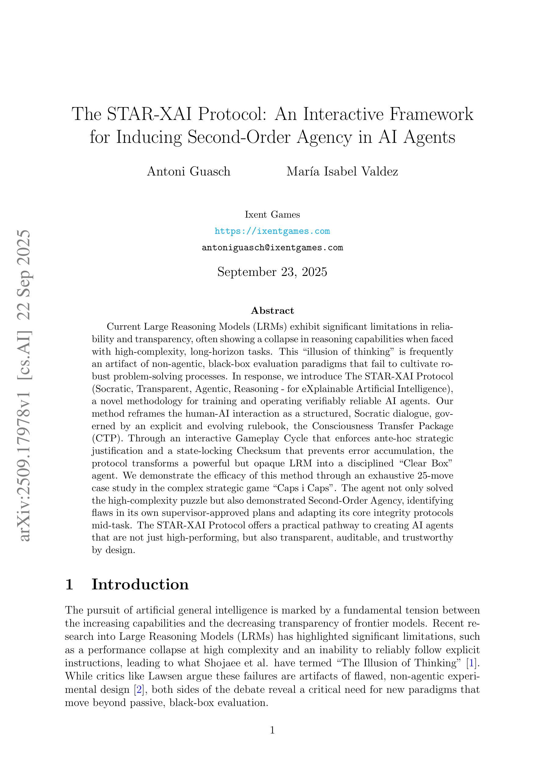 本文指出当前大型推理模型(LRMs)在应对高复杂度、长期任务时存在可靠性和透明度方面的显著局限性,表现为推理能力的崩溃。为此,作者提出了一种新的训练和操作可靠人工智能代理的方法——STAR-XAI协议。该协议通过结构化、苏格拉底式的对话,以及明确的不断进化的规则手册——意识转移包(CTP),将人类与AI的互动进行重构。此外,通过执行前的战略合理化、状态锁定校验和等机制,该协议将强大的但模糊的大型模型转变为有纪律的“清晰盒子”代理。作者通过一个复杂的战略游戏“Capscaps”的25步案例研究,证明了该方法的有效性。该代理不仅解决了高复杂度谜题,还表现出二阶代理能力,识别自身监督者批准计划的缺陷,并在任务中途调整其核心完整性协议。STAR-XAI协议为创建透明、可审计、可信赖的AI代理提供了实用途径。