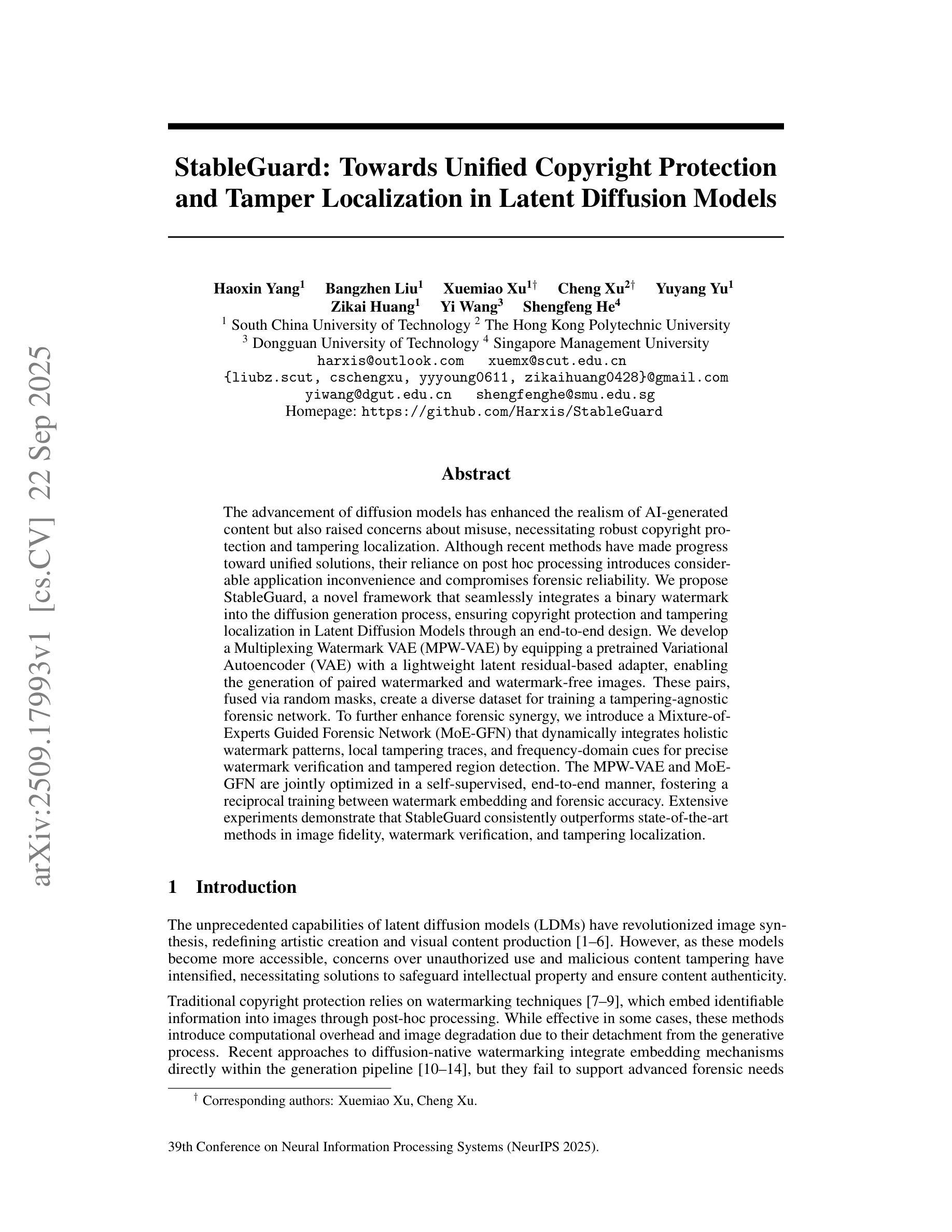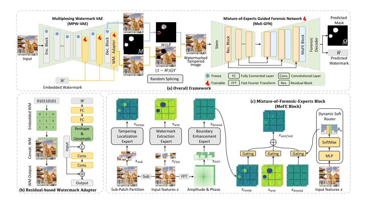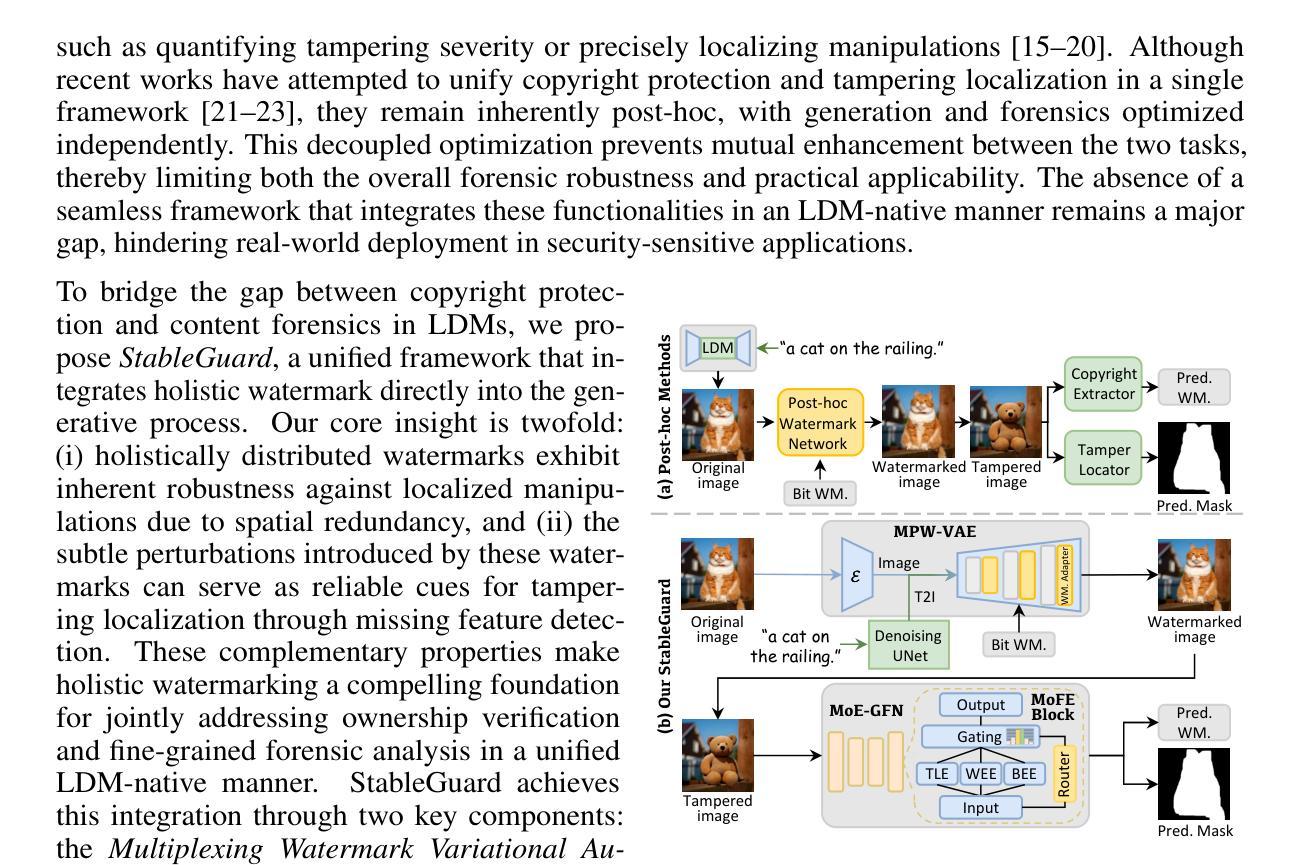 扩散模型的进步提高了人工智能生成内容的真实性,但也引发了关于误用的担忧,这需要进行强有力的版权保护和篡改定位。尽管最近的方法在统一解决方案方面取得了进展,但它们对事后处理的依赖带来了相当大的应用不便和鉴定可靠性的妥协。我们提出了StableGuard,这是一个无缝集成二进制水印到扩散生成过程的新型框架,通过端到端设计,确保在潜在扩散模型中的版权保护和篡改定位。我们开发了一种多路复用水印VAE(MPW-VAE),它通过为预训练的变分自动编码器(VAE)配备轻量级的基于潜在残留的适配器,能够生成配对的水印和无水印图像。这些配对图像通过随机掩模融合,创建了一个多样化的数据集,用于训练对篡改无关的法网。为了进一步增强法网协同作用,我们引入了混合专家指导法网(MoE-GFN),它动态地整合整体水印模式、局部篡改痕迹和频域线索,进行精确的水印验证和篡改区域检测。MPW-VAE和MoE-GFN以自我监督的方式进行联合优化,以端到端的方式促进水印嵌入与鉴定准确性之间的互惠训练。大量实验表明,StableGuard在图像保真度、水印验证和篡改定位方面始终优于最新方法。
