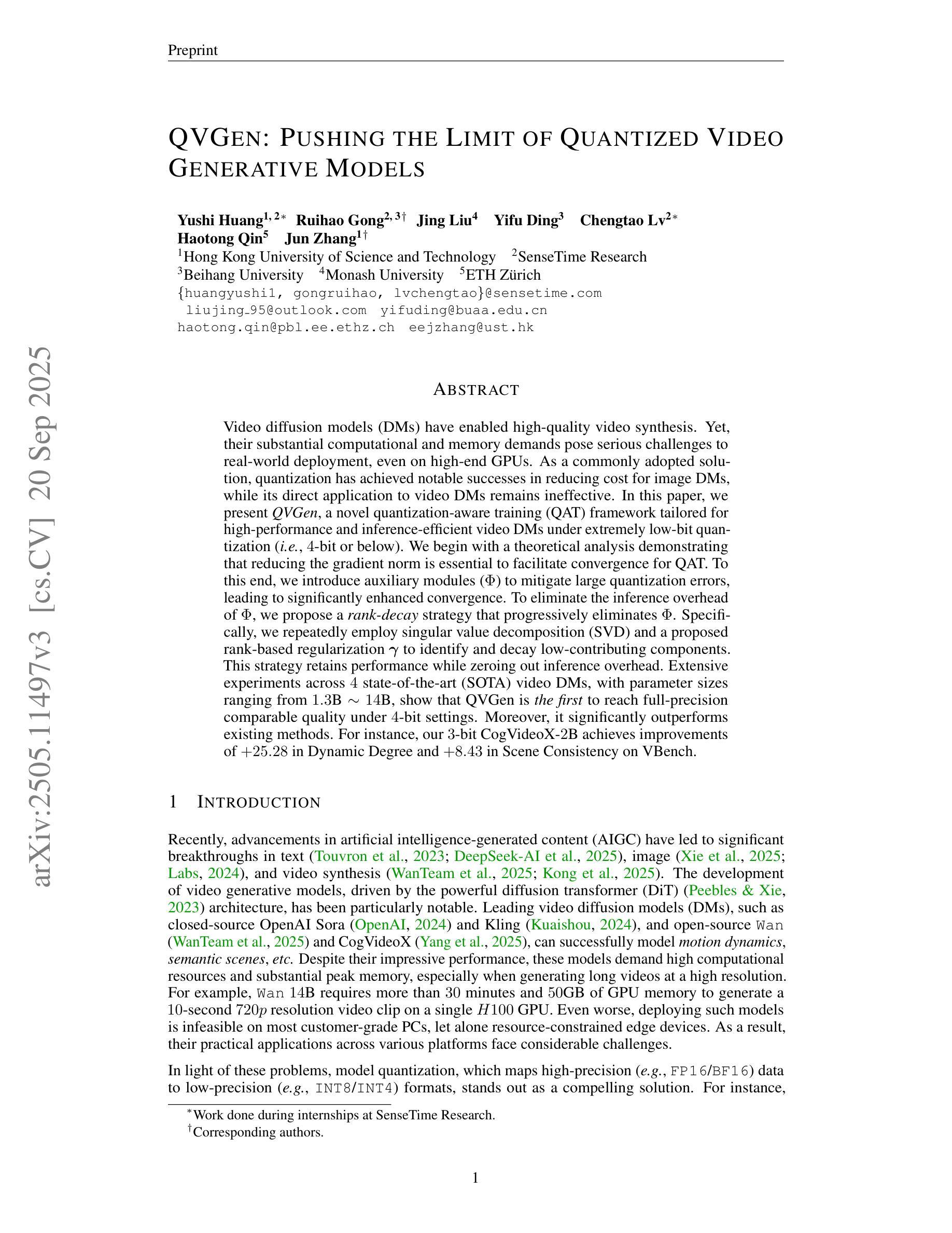 视频扩散模型(DMs)虽然可以实现高质量的视频合成,但其巨大的计算和内存需求阻碍了实际应用,特别是在高端GPU上的应用。量化是一种广泛采用的方法,能够成功降低图像DM的成本,但直接应用于视频DM则效果不佳。本文提出QVGen,一个针对高性能和推理效率的视频DM的量化感知训练(QAT)框架,可在极低比特量化(如4位及以下)下工作。理论分析表明,减少梯度范数是促进QAT收敛的关键。通过引入辅助模块来减轻大量量化误差,显著提高了收敛性。为了消除辅助模块的推理开销,提出了一种排名衰减策略,通过逐步消除辅助模块实现性能保留并消除推理开销。实验证明,QVGen在4位设置下首次达到全精度可比质量,并显著优于现有方法。例如,我们的3位CogVideoX-2B在VBench上的动态度和场景一致性分别提高了+25.28和+8.43。