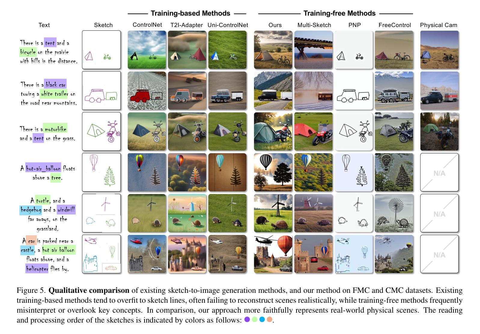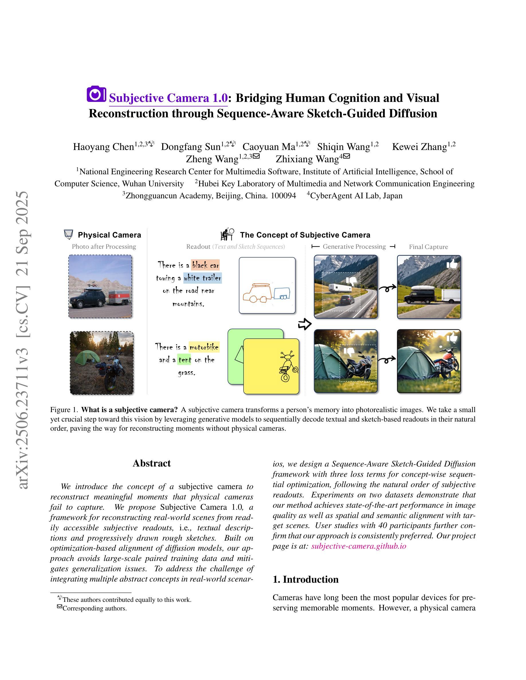 主观相机的概念被引入以重建物理相机无法捕捉的有意义时刻。我们提出主观相机1.0,这是一个从易于获取的主观读数(如文本描述和渐进式粗略草图)重建现实场景的框架。该框架基于扩散模型的优化对齐,避免了大规模配对训练数据,并缓解了泛化问题。为了解决将多个抽象概念融入现实场景的挑战,我们设计了一个序列感知草图引导扩散框架,包含三个用于概念级顺序优化的损失项,遵循主观读数的自然顺序。在两个数据集上的实验表明,我们的方法在图像质量以及空间和目标场景语义对齐方面达到最佳性能。由40名参与者进行的研究进一步证实了我们方法的优越性。