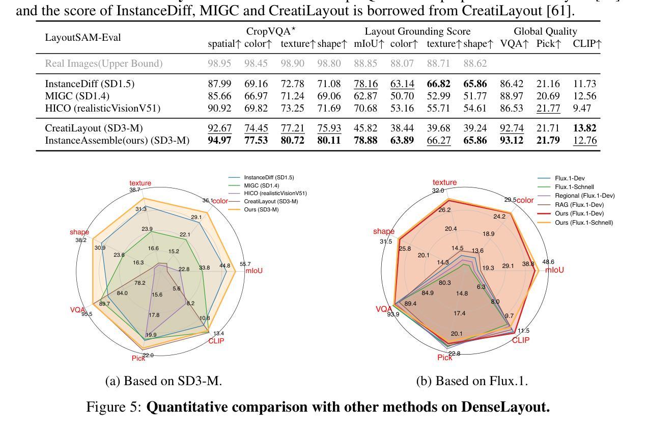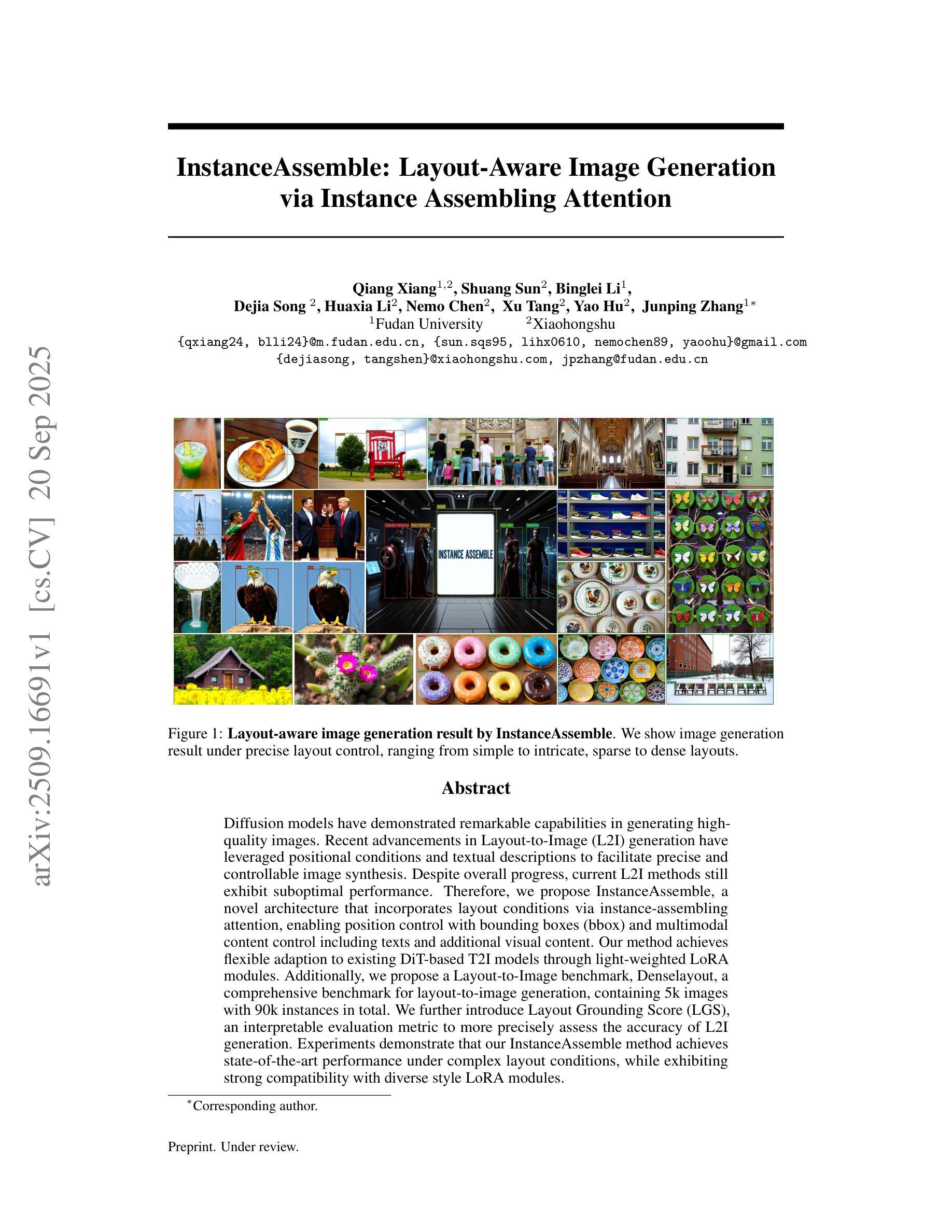 扩散模型在生成高质量图像方面表现出卓越的能力。最近的Layout-to-Image(L2I)生成技术通过位置条件和文本描述,促进了精确可控的图像合成。尽管有所进展,但当前的L2I方法性能仍不理想。因此,我们提出了InstanceAssemble,一种通过实例组装注意力机制融入布局条件的新型架构,实现通过边界框(bbox)进行位置控制,以及包括文本和额外视觉内容的多模态内容控制。我们的方法通过轻量级的LoRA模块,灵活适应现有的DiT-based T2I模型。此外,我们还推出了Layout-to-Image基准测试Denselayout,这是一个包含5000张图像、总计9万个实例的全面布局到图像生成的基准测试。我们还介绍了布局接地分数(LGS),一个可解释的评价指标,以更精确地评估L2I生成的准确性。实验表明,我们的InstanceAssemble方法在复杂的布局条件下达到了最佳性能,同时与各种风格的LoRA模块表现出强大的兼容性。
