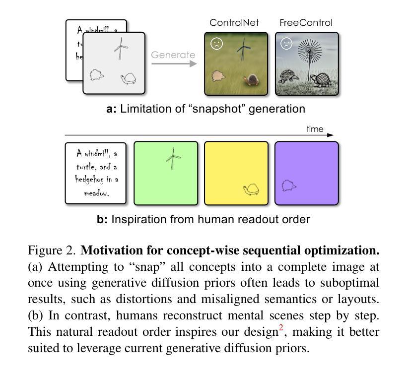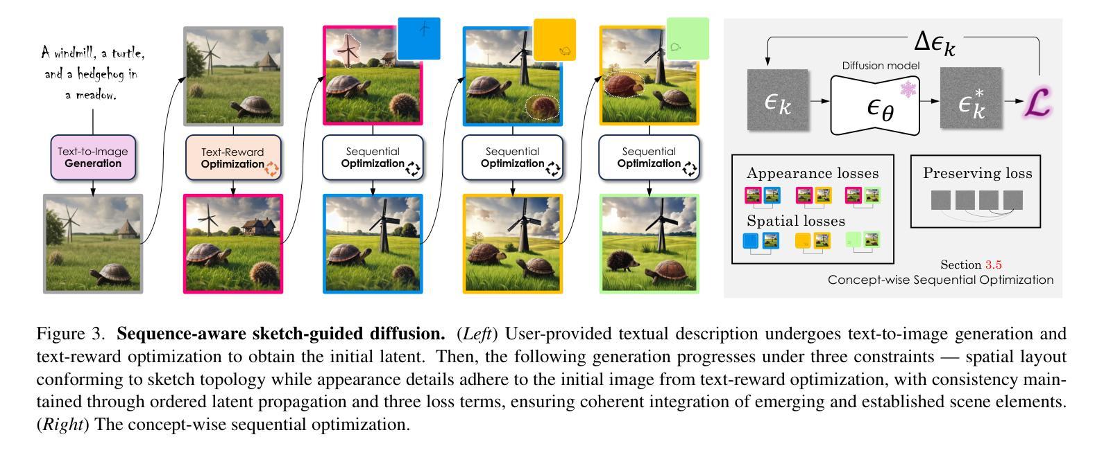 - 设计了序列感知草图引导扩散框架,通过三个损失项进行概念级的顺序优化。