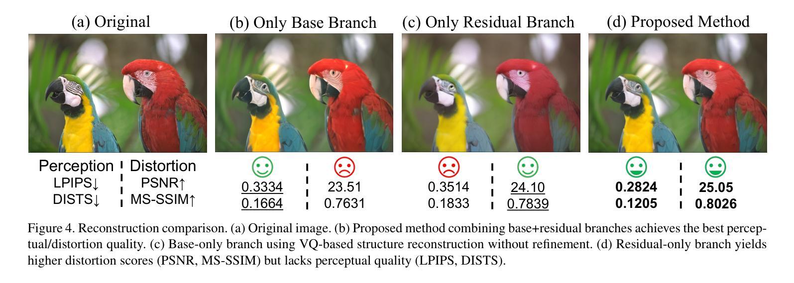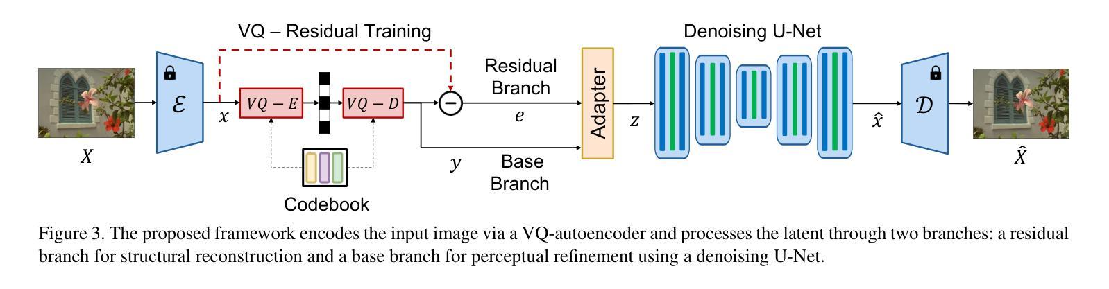 本文提出一种基于单步扩散模型的图像压缩方法,可在超低比特率下实现高感知质量和快速解码。该方法通过VQ-Residual训练和速率感知噪声调制两项关键技术,实现了结构基础码和学得残差的因子分解,捕捉了全局几何结构和高频细节。实验表明,该方法在压缩性能上与最新技术相当,解码速度比先前的扩散方法提高了约50倍,极大地提高了生成码实的实用性。