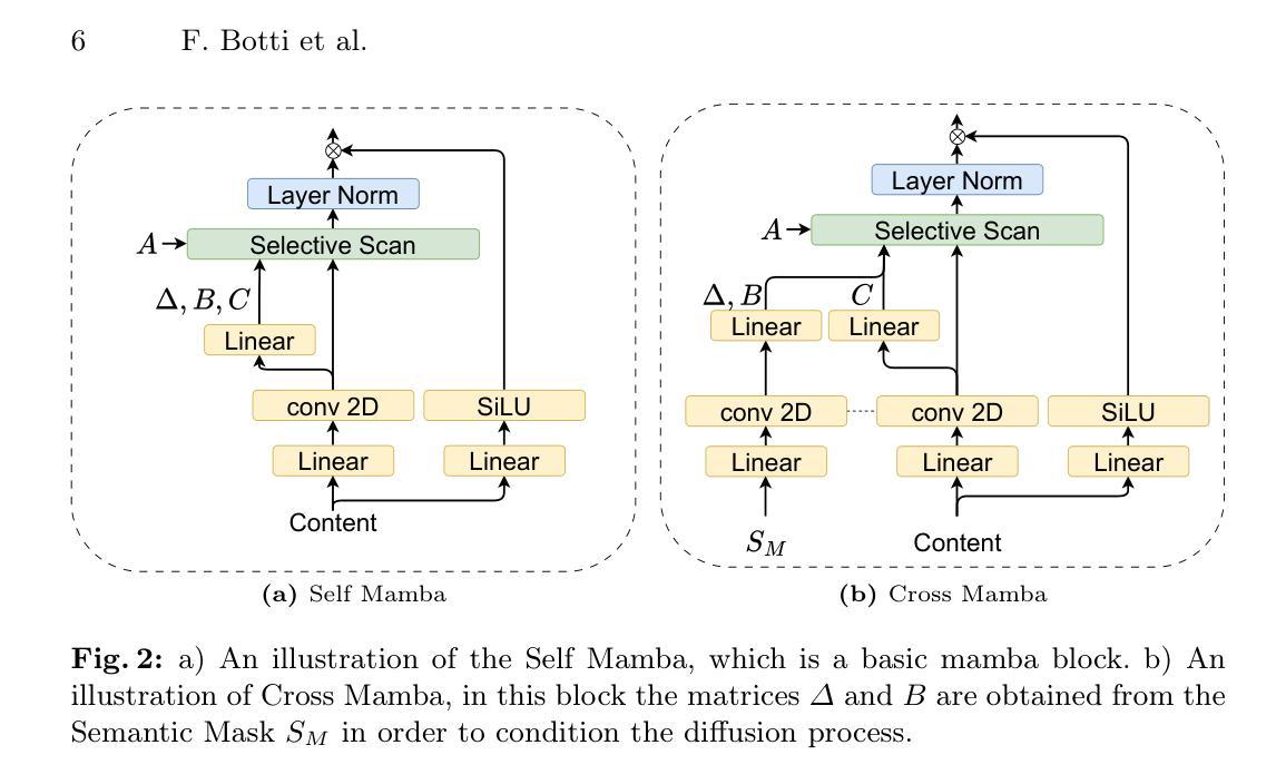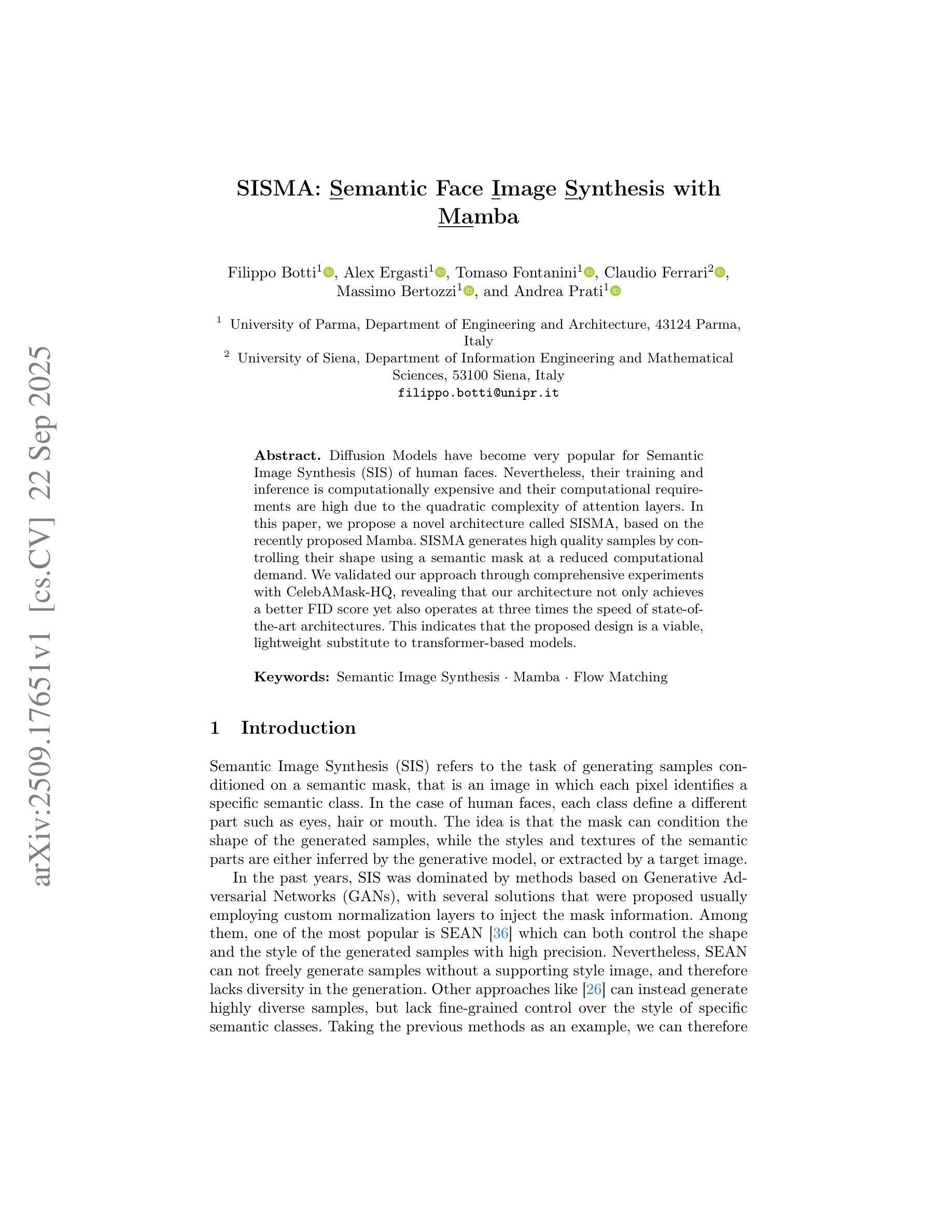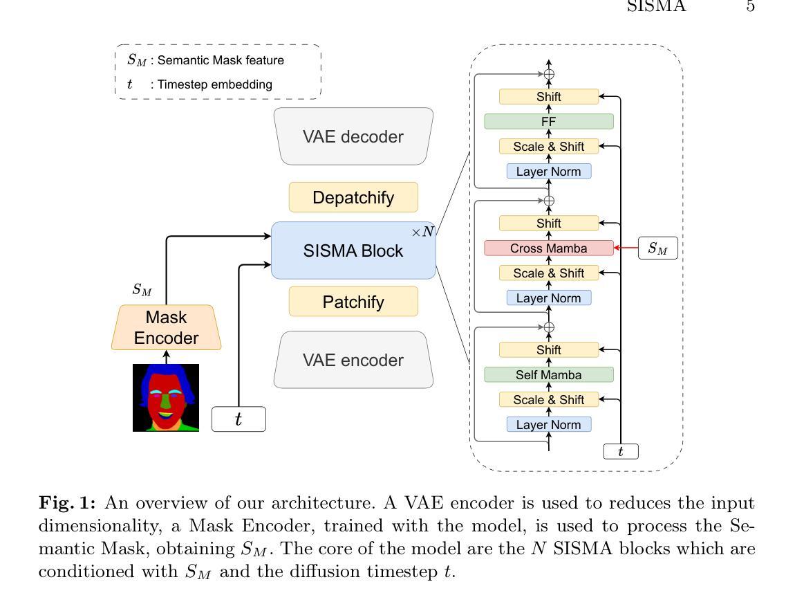 扩散模型(Diffusion Models)已经在人类面部的语义图像合成(SIS)领域变得非常受欢迎。然而,由于注意力层的二次复杂性,其训练和推理的计算成本很高且计算要求也很高。在本文中,我们提出了一种基于最新提出的Mamba的新型架构,称为SISMA。SISMA通过利用语义掩膜控制形状生成高质量的样本,并在减少计算需求的情况下进行。我们通过使用CelebAMask-HQ进行的大量实验验证了我们的方法,结果表明我们的架构不仅实现了更好的FID得分,而且运行速度是现有技术架构的三倍。这表明所提出的设计是一个可行的、轻量级的替代基于变压器模型的选择。