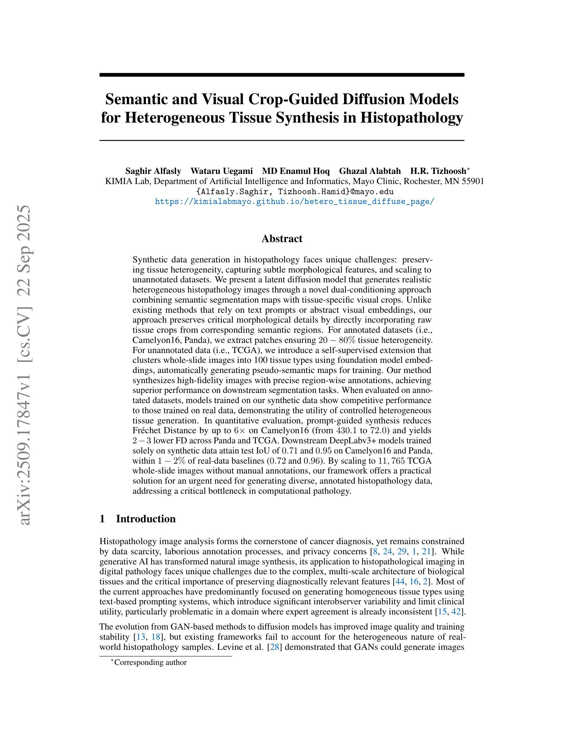 在病理学中对合成数据生成面临着独特的挑战,如保持组织异质性、捕捉微妙的形态特征和扩展到未标注的数据集。我们提出了一种潜在扩散模型,通过一种新颖的双重条件方法结合语义分割地图和特定组织的视觉裁剪,生成逼真的异质性病理学图像。不同于依赖文本提示或抽象视觉嵌入的现有方法,我们的方法通过直接结合来自相应语义区域的原始组织裁剪,保留了关键的形态细节。对于已标注的数据集(例如Camelyon16和Panda),我们提取斑块,确保20-80%的组织异质性。对于未标注的数据(例如TCGA),我们引入了一种自监督扩展,使用基础模型嵌入将整个幻灯片图像聚类为100种组织类型,自动生成伪语义地图进行训练。我们的方法合成高保真图像,具有精确的区域注释,并在下游分割任务上实现了卓越的性能。在已标注数据集上进行评估,经我们的合成数据训练模型的表现与真实数据训练的模型表现相当,证明了可控异质性组织生成的实用性。在定量评估中,提示引导的合成将Camelyon16上的Frechet距离减少了高达6倍(从430.1降至72.0),并且在Panda和TCGA上的FD降低了2-3倍。仅经合成数据训练的下游DeepLabv3+模型在Camelyon16和Panda上的测试IoU达到0.71和0.95,与真实数据基准测试值(分别为0.72和0.96)相差仅1-2%。通过扩展到没有手动标注的TCGA的11,765张全幻灯片图像,我们的框架为解决迫切需求的生成多样、标注的病理学数据提供了切实可行的解决方案,解决了计算病理学中的关键瓶颈问题。