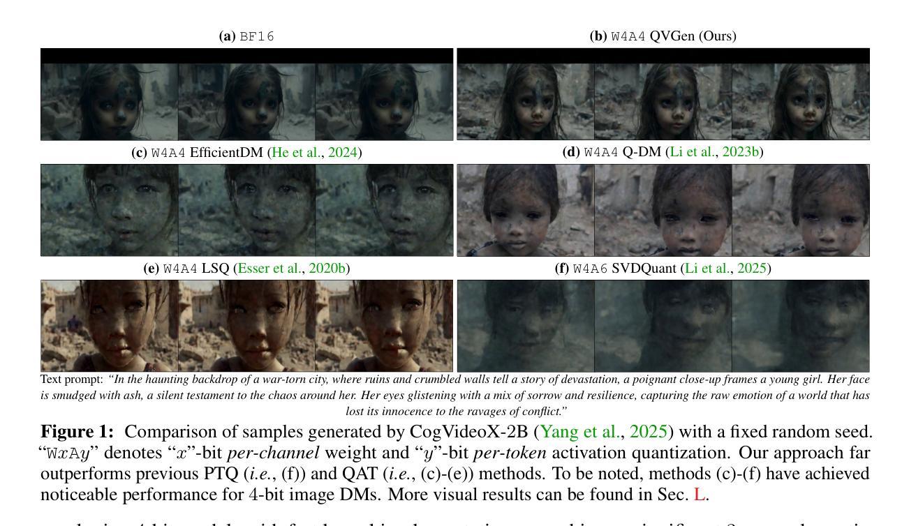 视频扩散模型(DMs)已经能够实现高质量的视频合成。然而,其巨大的计算和内存需求对实际部署带来了严峻挑战,即使在高端GPU上也是如此。作为一种常用的解决方案,量化在降低图像DM的成本方面取得了显著的成效,而直接应用于视频DM则仍然无效。在本文中,我们提出了QVGen,这是一个针对极端低比特量化(例如4位及以下)下高性能和推理效率的视频DM量身定制的量化感知训练(QAT)框架。我们首先进行理论分析,证明降低梯度范数对于促进QAT的收敛至关重要。为此,我们引入了辅助模块(Φ)来缓解大量化误差,从而显着增强收敛性。为了消除Φ的推理开销,我们提出了一种排名衰减策略,该策略逐步消除Φ。具体来说,我们反复使用奇异值分解(SVD)和提出的基于排名的正则化γ来识别和衰减低贡献成分。此策略在保持性能的同时消除了推理开销。在4种最先进的视频DMs上的广泛实验,参数大小从1.3B到14B不等,表明QVGen首次在4位设置下达到全精度相当的质量。而且,它显著优于现有方法。例如,我们的3位CogVideoX-2B在VBench上的动态度提高了+25.28,场景一致性提高了+8.43。