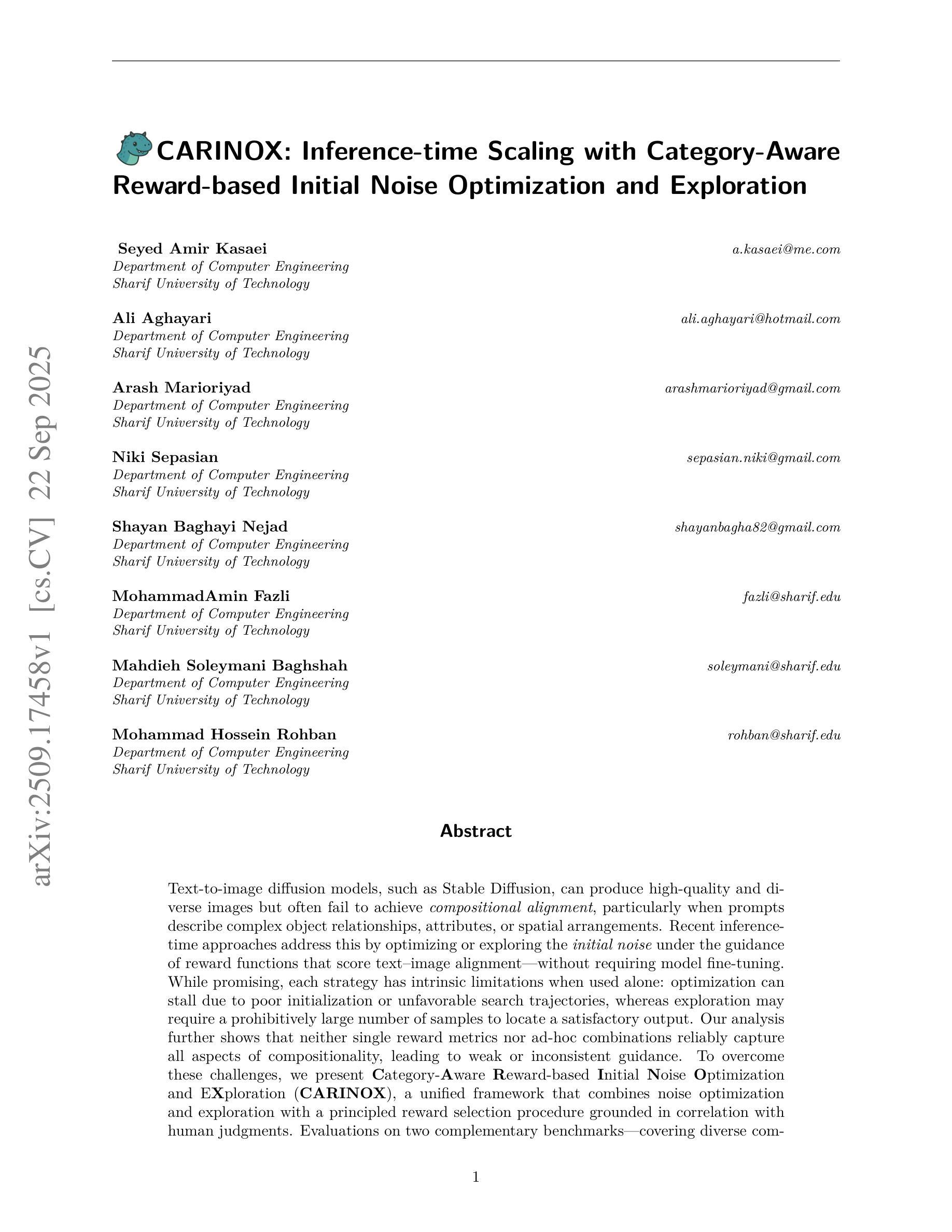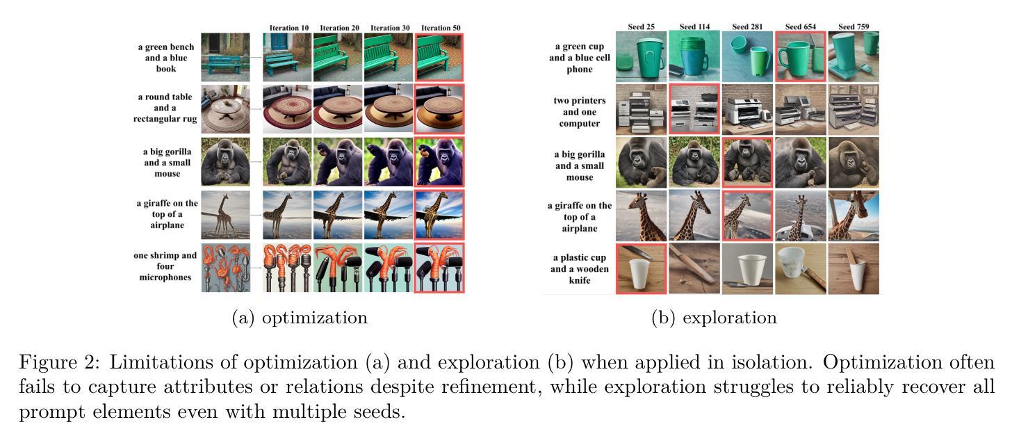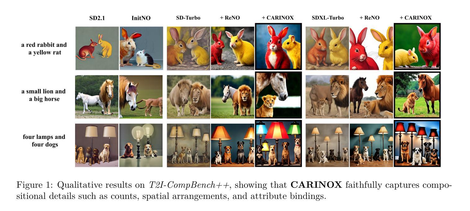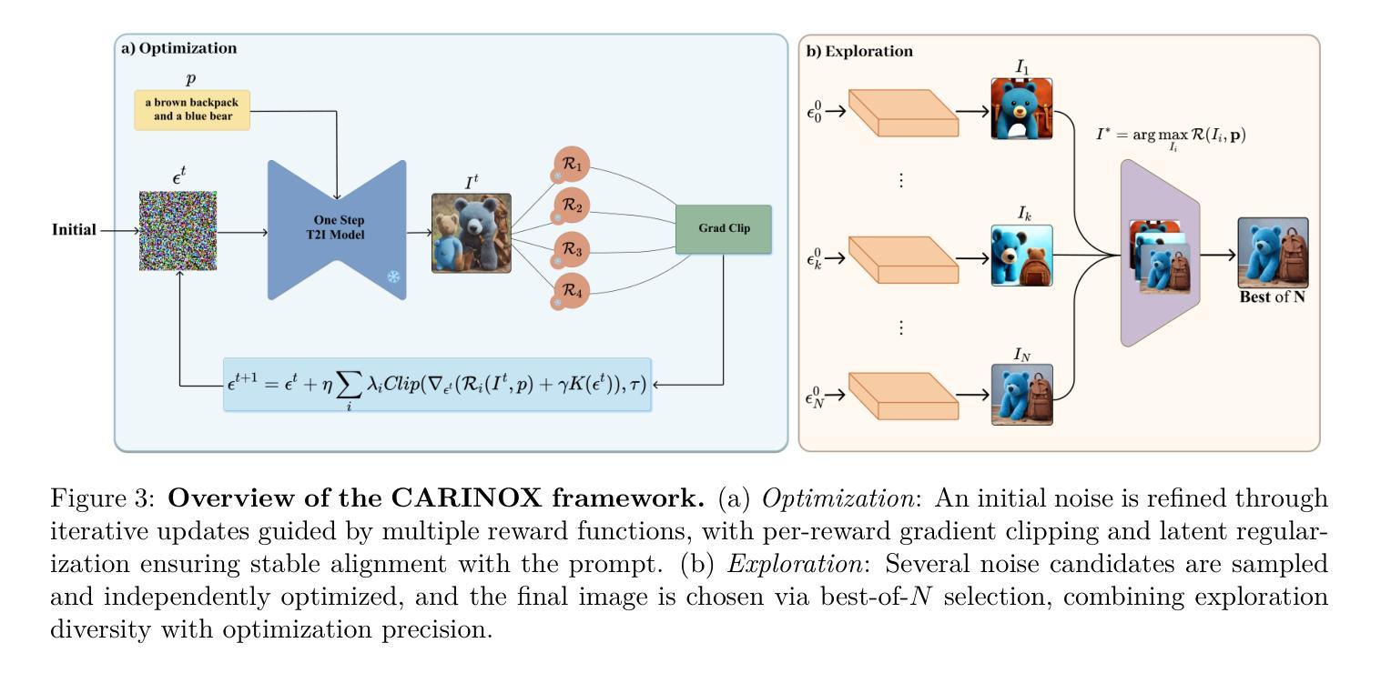 文本到图像的扩散模型,如Stable Diffusion,能够产生高质量和多样化的图像,但往往难以实现组成对齐,特别是在提示描述复杂的对象关系、属性或空间排列时。最近的推理时间方法通过优化或探索初始噪声来解决这个问题,在奖励函数的指导下评分文本图像对齐,而无需对模型进行微调。虽然前景广阔,但每种策略单独使用时都有固有的局限性:优化可能会因初始化不佳或搜索轨迹不利而陷入僵局,而探索可能需要大量的样本才能找到满意的输出。我们的进一步分析表明,无论是单一奖励指标还是临时组合,都无法可靠地捕获所有方面的组合性,导致指导不力或不一致。为了克服这些挑战,我们提出了基于类别的奖励初始噪声优化和探索(CARINOX),这是一个结合了噪声优化和探索的统一框架,采用基于与人类判断相关的原则性奖励选择程序。在两个互补的基准测试上的评估,涵盖了各种组成挑战,表明CARINOX在T2I-CompBench++上平均对齐得分提高了+16%,在HRS基准测试上提高了+11%,在所有主要类别中一致地优于最新的优化和探索方法,同时保持了图像的质量和多样性。项目页面可在此URL找到。