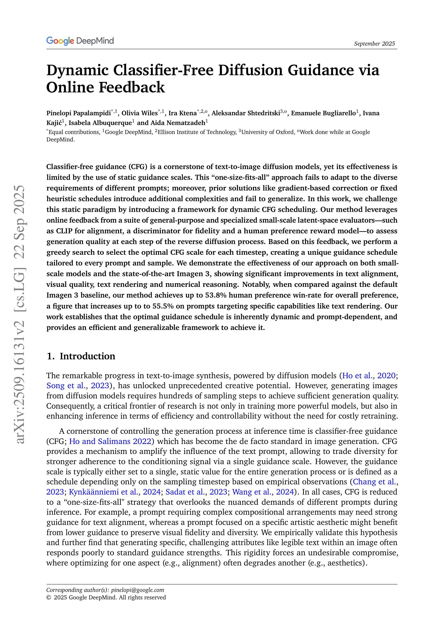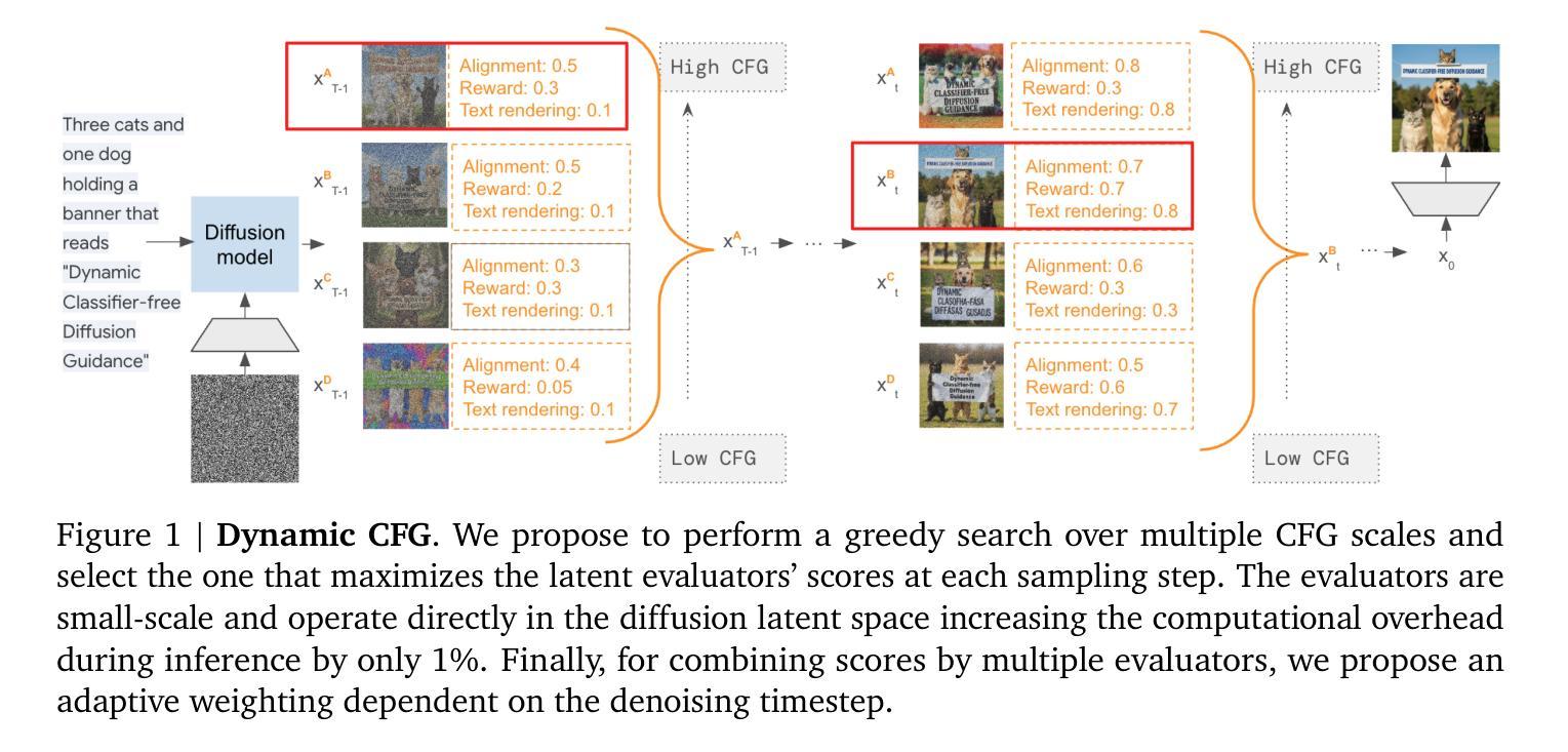 无分类器引导(CFG)是文本到图像扩散模型的核心,但其有效性受到静态引导尺度使用的限制。“一刀切”的方法无法满足不同提示的多样化需求;此外,先前的解决方案,如基于梯度的校正或固定的启发式时间表,引入了额外的复杂性,并且无法推广。在这项工作中,我们通过引入动态CFG调度框架来挑战这一静态模式。我们的方法利用一系列通用和专用小型潜在空间评估的在线反馈,如CLIP对齐、鉴别器保真度以及人类偏好奖励模型,来评估反向扩散过程每一步的生成质量。基于这些反馈,我们执行贪婪搜索来选择每个时间步的最佳CFG尺度,为每个提示和样本创建独特的指导时间表。我们在小型模型以及最先进的Imagen 3上都证明了我们的方法的有效性,在文本对齐、视觉质量、文本渲染和数值推理方面取得了显著的改进。特别是与默认的Imagen 3基线相比,我们的方法在总体偏好上达到了53.8%的人类偏好胜率,在针对特定能力(如文本渲染)的提示上,这一数字最高可达55.5%。我们的工作证明,最佳的引导时间表本质上是动态的,并且依赖于提示,并提供了一个高效且可推广的框架来实现它。