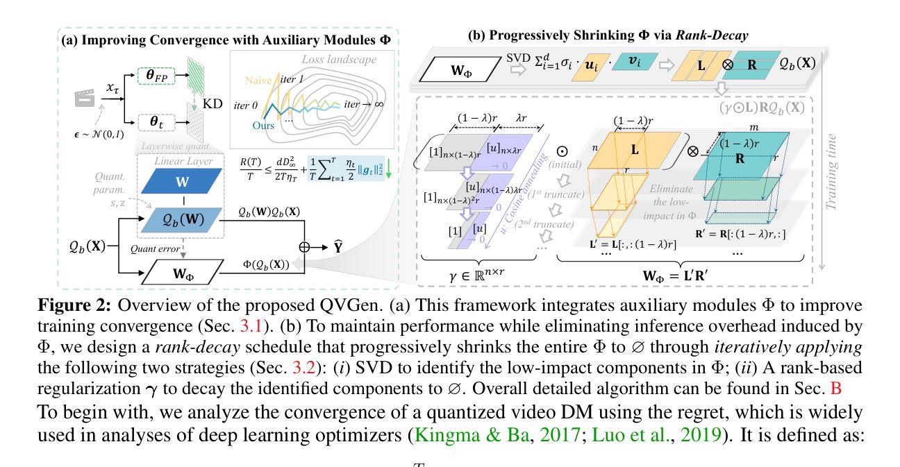 - QVGen是一个针对视频DM的量化感知训练(QAT)框架,适用于极低比特量化设置。