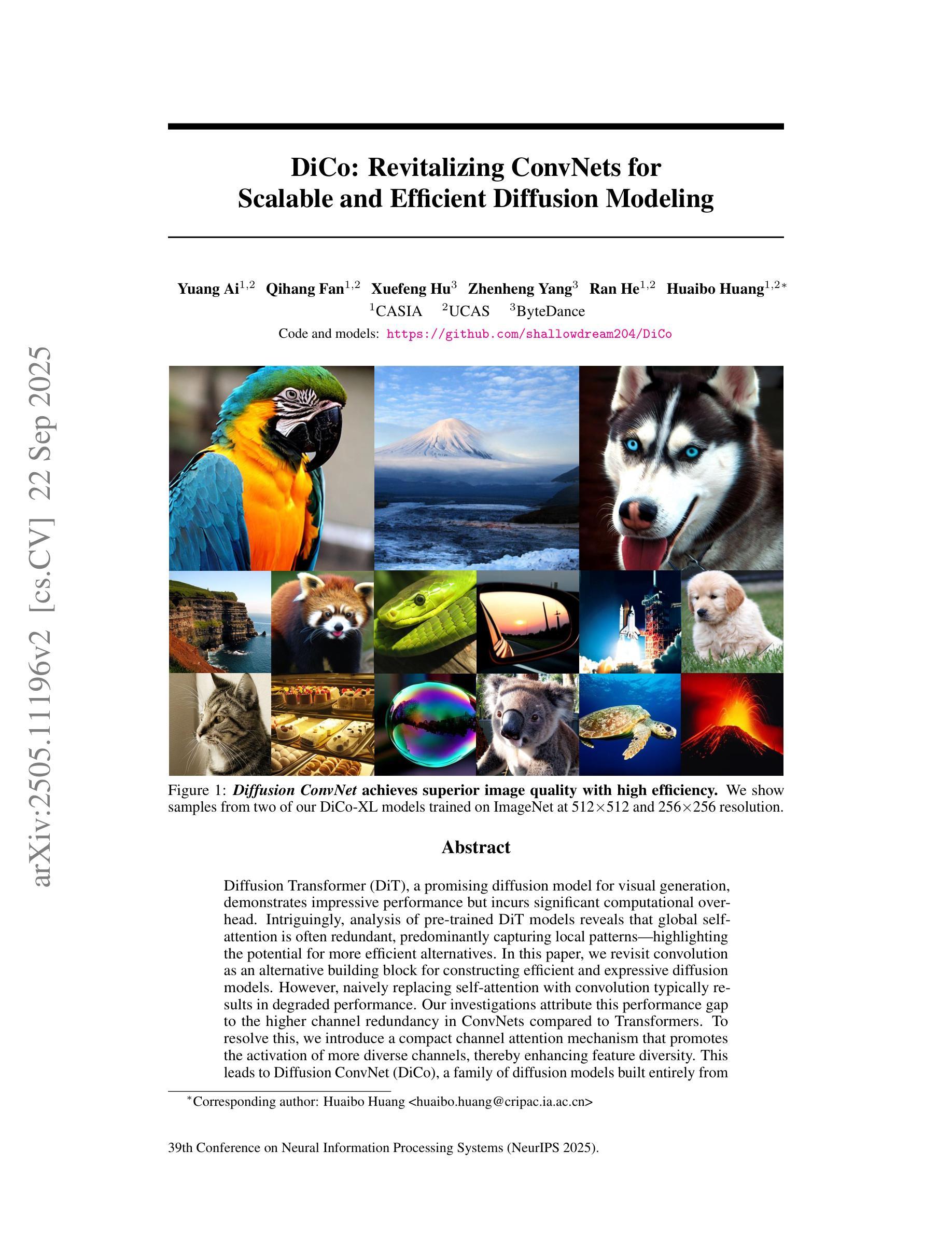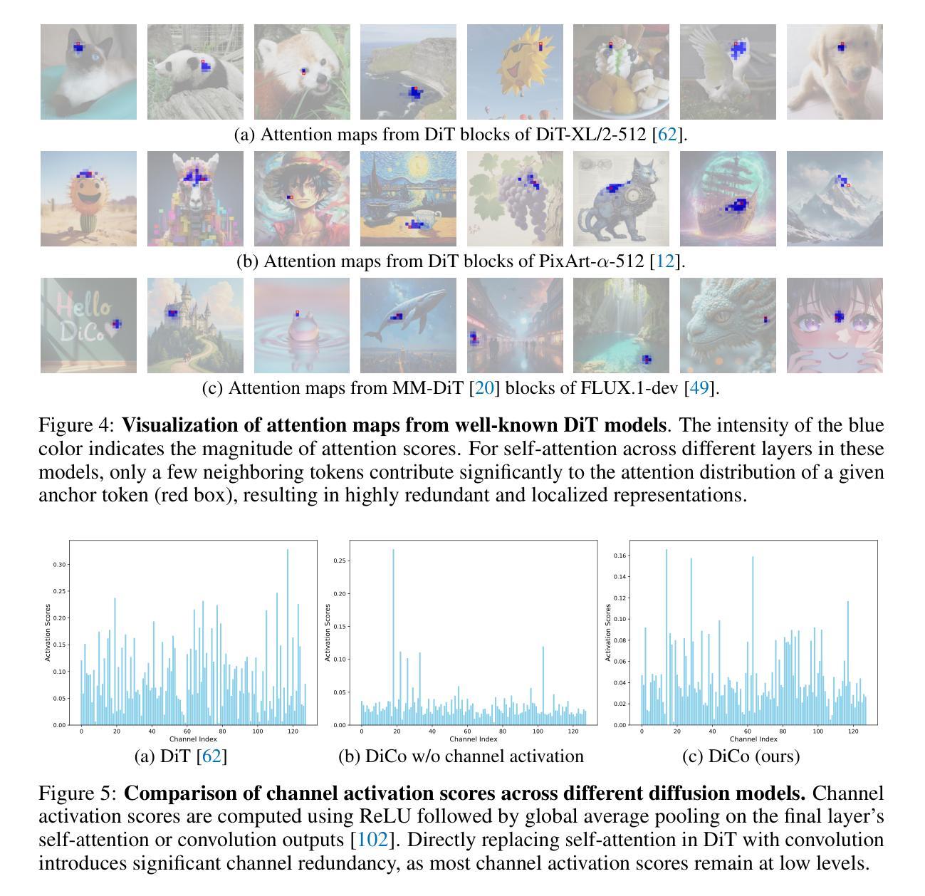 扩散Transformer(DiT)是一种有前景的视觉生成扩散模型,它表现出令人印象深刻的效果,但带来了巨大的计算开销。有趣的是,对预训练的DiT模型的分析表明,全局自注意力通常是冗余的,主要捕捉局部模式,这突显了更高效替代方案的潜力。在本文中,我们重新审视卷积作为构建高效且表达性扩散模型的替代构建块。然而,天真地用卷积替换自注意力通常会导致性能下降。我们的调查将这一性能差距归因于与Transformer相比,ConvNet中的通道冗余度更高。为解决这一问题,我们引入了一种紧凑的通道注意力机制,该机制促进了更多不同通道的激活,从而增强了特征多样性。这导致了完全由标准ConvNet模块构建的扩散模型家族——扩散卷积网络(DiCo)。在条件ImageNet生成基准测试中,DiCo-XL在256x256分辨率下实现了FID为2.05,在512x512分辨率下实现了2.53,相对于DiT-XL/2分别实现了2.7x和3.1x的加速。此外,在MS-COCO上的实验结果表明,完全卷积的DiCo在文本到图像生成方面表现出强大的潜力。代码:https://github.com/shallowdream204/DiCo。