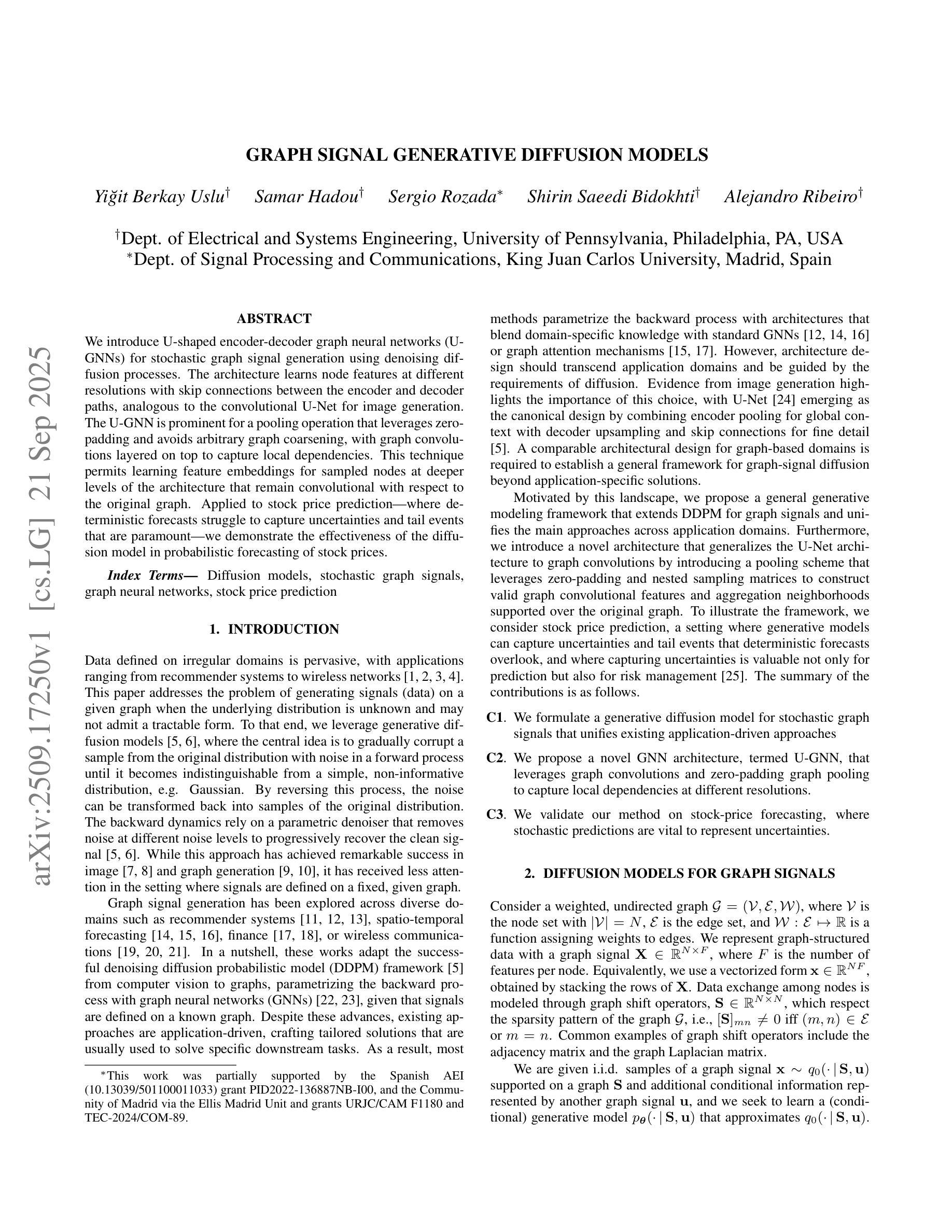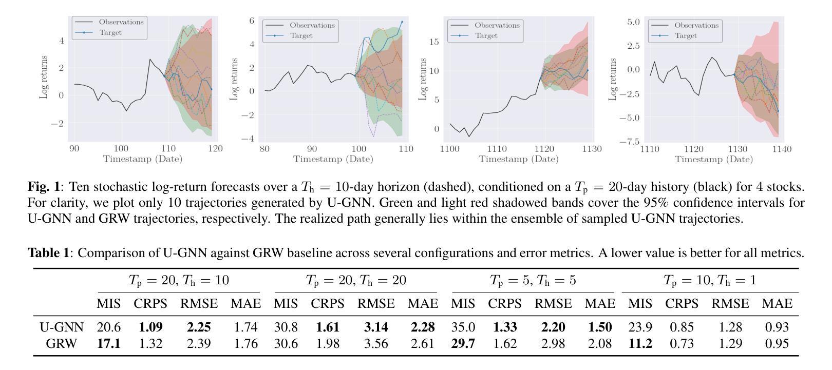 我们引入U型编码器-解码器图神经网络(U-GNNs),利用去噪扩散过程进行随机图信号生成。该架构通过编码器与解码器路径之间的跳过连接学习不同分辨率的节点特征,类似于用于图像生成的卷积U-Net。U-GNN的突出之处在于它的池化操作,该操作利用零填充并避免任意的图简化,并在其上叠加图卷积以捕获局部依赖性。这项技术允许在架构的更深层次上,对采样节点进行特征嵌入学习,相对于原始图保持卷积。将其应用于股票价格预测——确定性预测很难捕捉不确定性和极端事件,而这些因素至关重要——我们展示了扩散模型在概率预测股票价格方面的有效性。