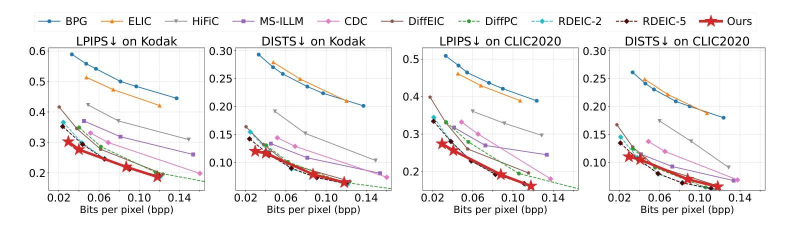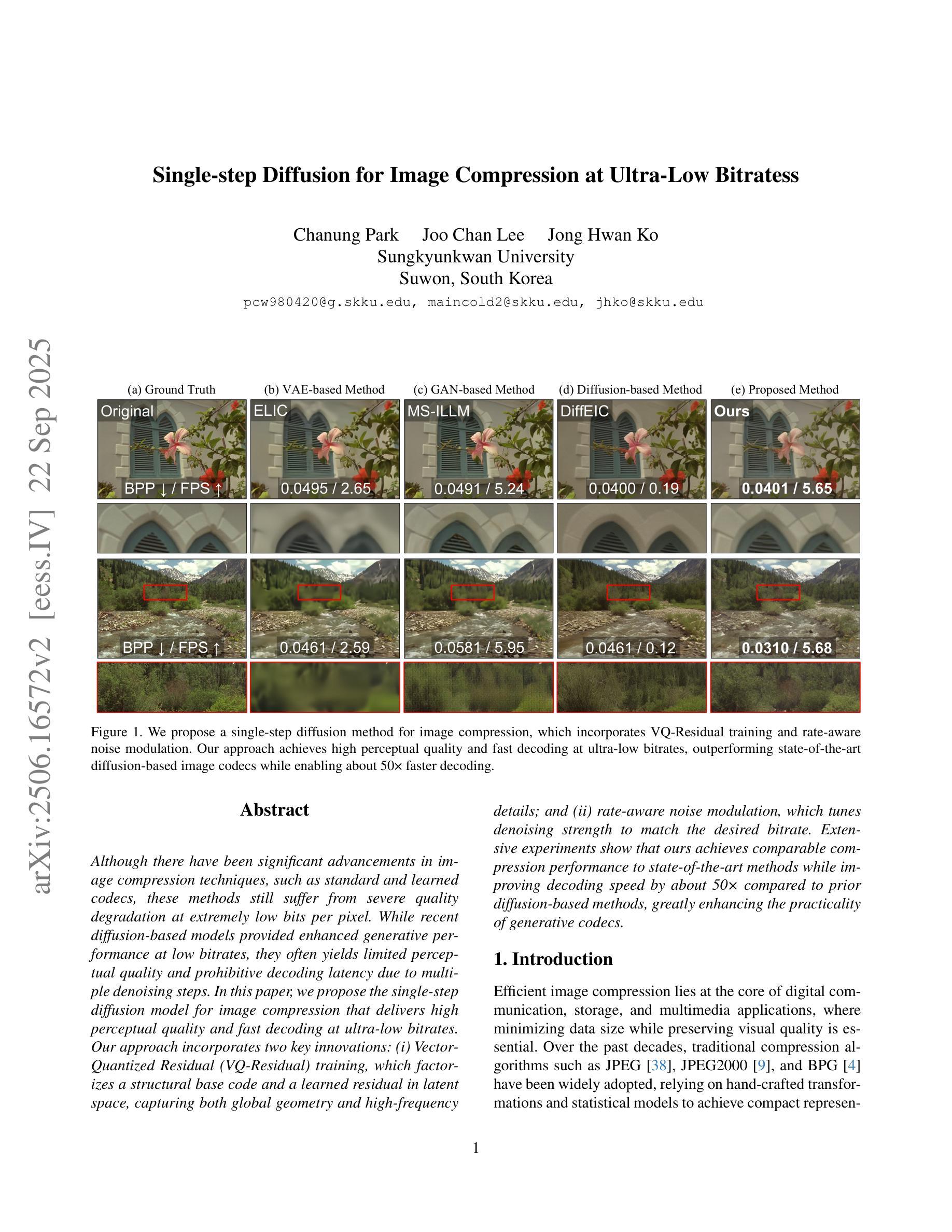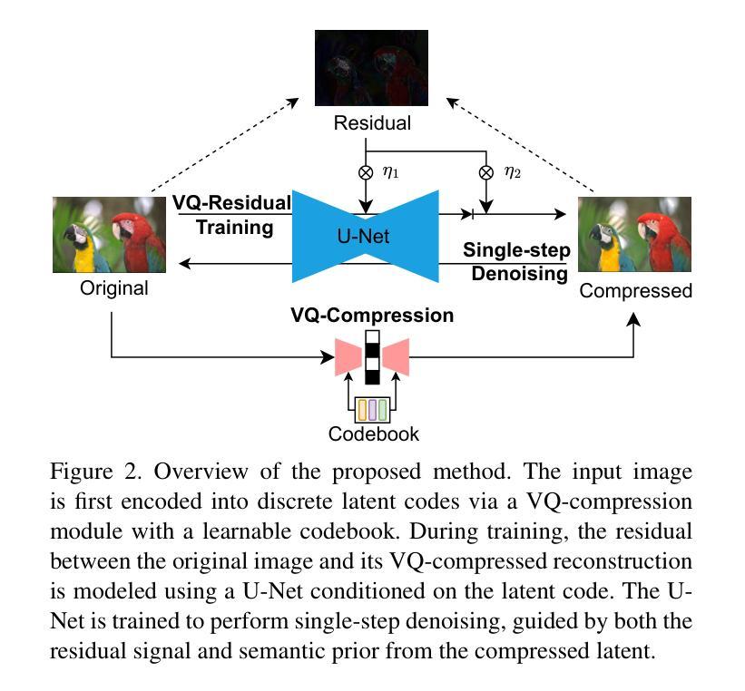 尽管图像压缩技术(如标准和基于学习的编码技术)已经取得了重大进展,但这些方法仍然面临极低比特率下的严重质量下降问题。虽然最近的基于扩散的模型在低比特率下提供了增强的生成性能,但由于多次去噪步骤,它们通常产生有限的感知质量和禁止的解码延迟。在本文中,我们提出了用于图像压缩的单步扩散模型,该模型在超低比特率下提供高感知质量和快速解码。我们的方法包含两个关键创新点:(i)向量量化残差(VQ-Residual)训练,它在潜在空间中分解结构基础代码和学习的残差,捕获全局几何和高频细节;(ii)速率感知噪声调制,它调整去噪强度以匹配所需的比特率。大量实验表明,我们的方法达到了与最新技术相当的性能,同时与先前的基于扩散的方法相比,解码速度提高了约50倍,大大提高了生成编码器的实用性。