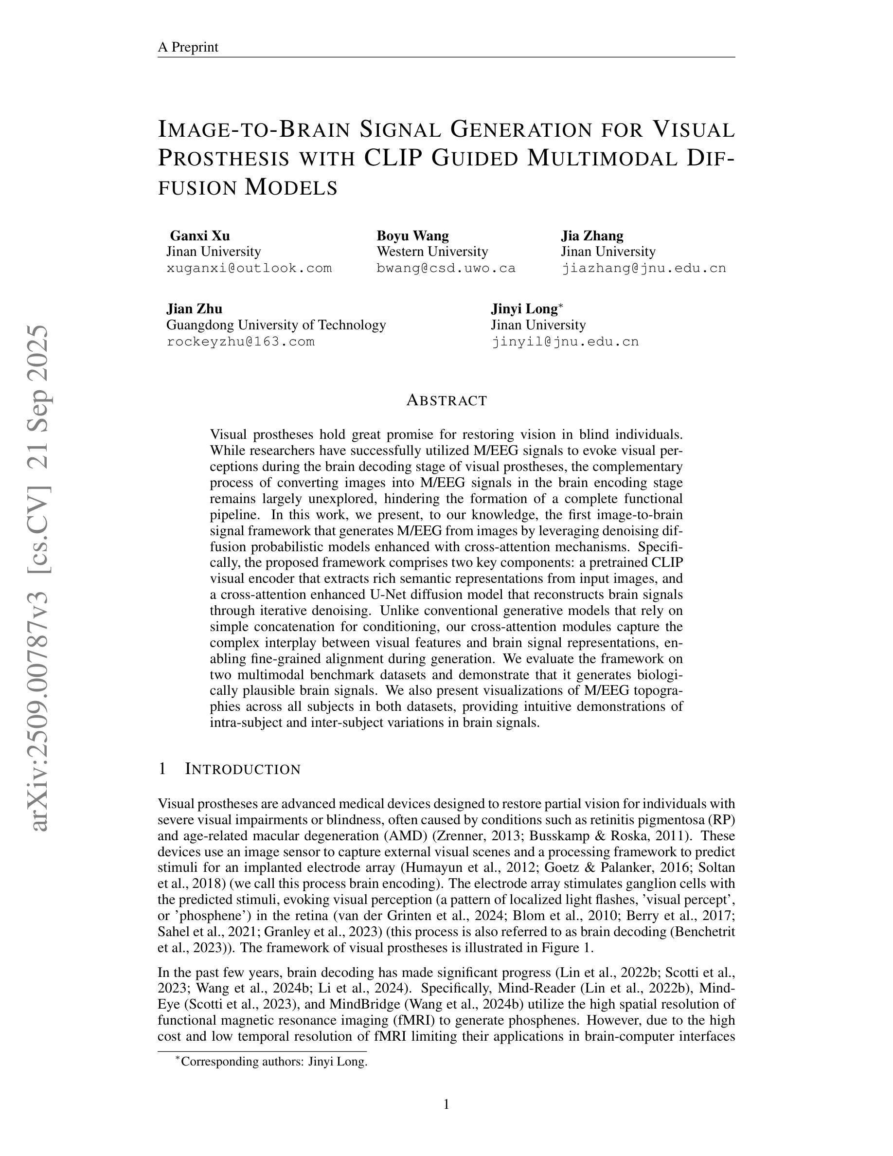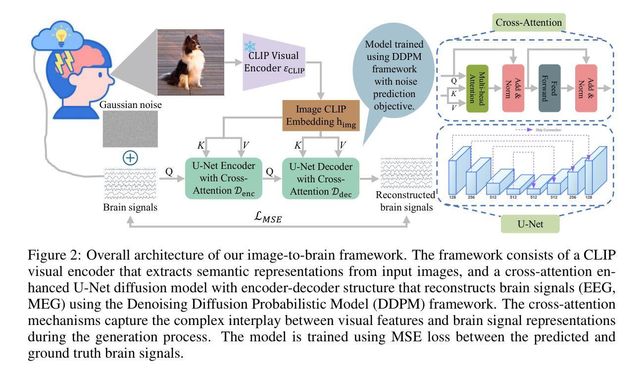视觉假体对恢复盲人的视力有着巨大潜力。虽然研究者已成功在视觉假体的脑解码阶段利用M/EEG信号来激发视觉感知,但大脑编码阶段将图像转换为M/EEG信号这一互补过程仍被大大忽视,阻碍了完整功能管道的形成。在这项工作中,我们呈现了(据我们所知)首个图像到脑信号的框架,该框架借助去噪扩散概率模型并增强交叉注意力机制,能够从图像生成M/EEG信号。具体来说,所提出的框架包含两个关键组件:预训练的CLIP视觉编码器,用于从输入图像中提取丰富的语义表示;增强交叉注意力的U-Net扩散模型,通过迭代去噪重建脑信号。不同于依赖简单拼接进行条件设置的传统生成模型,我们的交叉注意力模块捕捉视觉特征和脑信号表示之间的复杂交互,从而在生成过程中实现精细对齐。我们在两个多模式基准数据集上评估了该框架,并证明其能够生成生物上合理的脑信号。此外,我们还展示了两个数据集中所有受试者的M/EEG地形图可视化,直观地展示了脑信号的受试者内和受试者间变化。