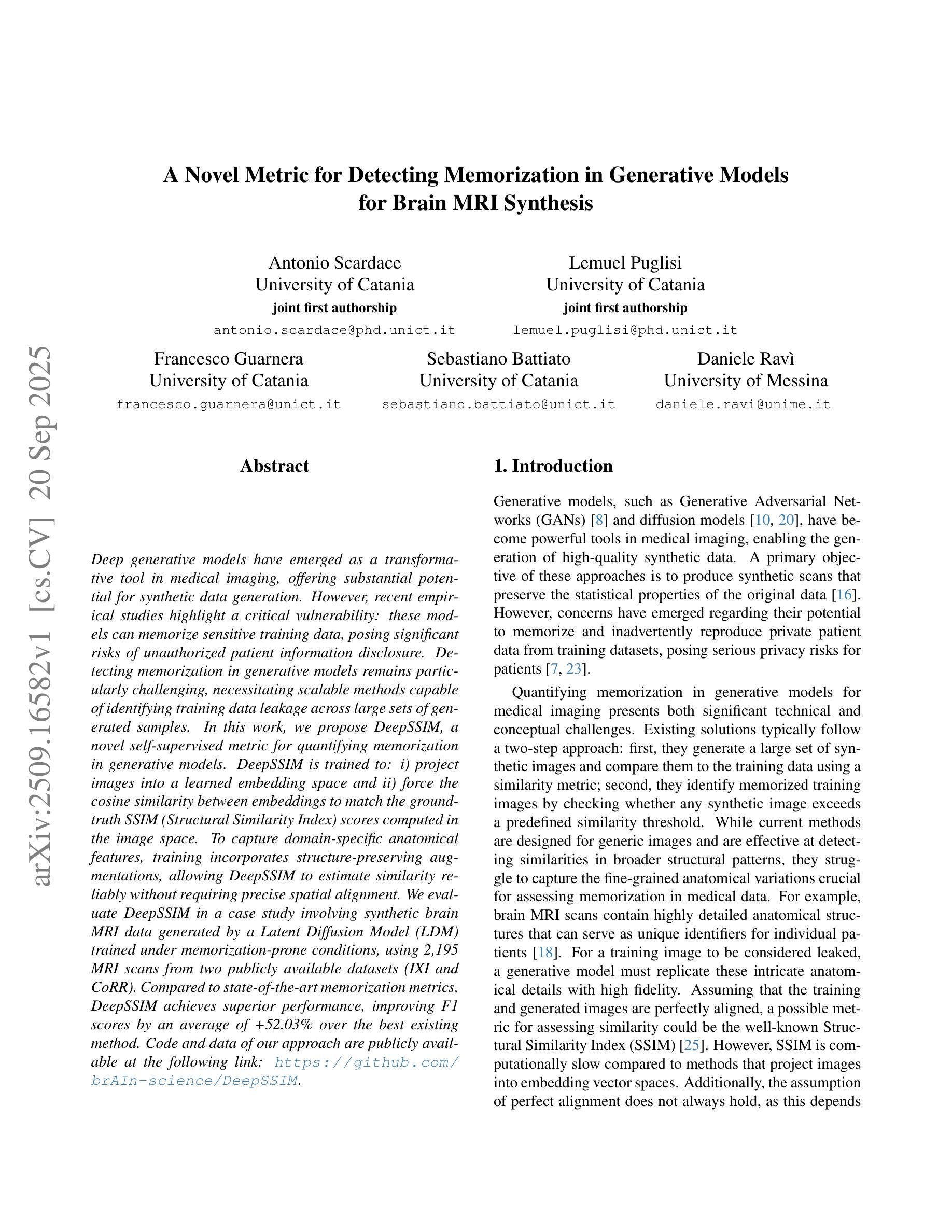 深度学习模型在医学成像领域展现出强大的生成能力,具有生成合成数据的巨大潜力。然而,最新实证研究揭示了其关键漏洞:这些模型会记忆敏感的训练数据,存在未经授权披露患者信息的风险。检测生成模型中的记忆化颇具挑战,需要能够在大量生成样本中识别训练数据泄露的可扩展方法。本研究提出一种新型自监督度量方法DeepSSIM,用于量化生成模型中的记忆化。DeepSSIM经过训练,能将图像投影到学习嵌入空间,并通过强制嵌入之间的余弦相似性与图像空间中计算的SSIM(结构相似性指数)得分匹配。为捕捉特定领域的解剖特征,训练过程中融入了结构保留增强技术,使DeepSSIM在无需精确空间对齐的情况下可靠地估计相似性。我们在涉及由潜在扩散模型(LDM)在易记忆条件下训练的合成脑MRI数据的案例研究中评估了DeepSSIM。与最先进的记忆化度量方法相比,DeepSSIM表现出卓越性能,平均将F1分数提高了+52.03%。我们的方法代码和数据可在以下链接公开获取:[链接地址]。