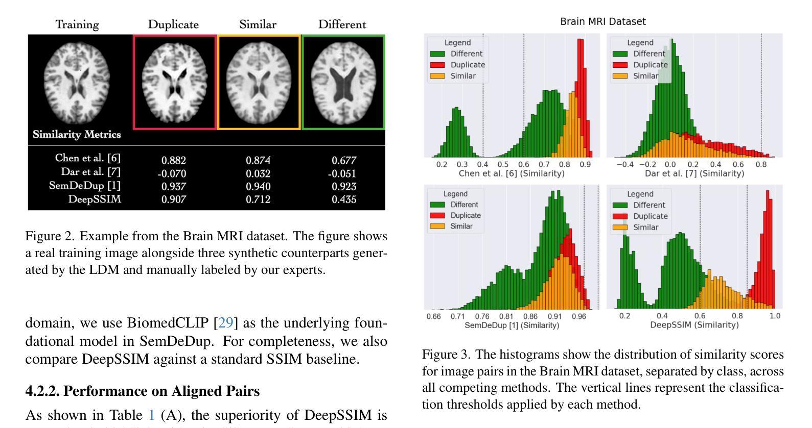 深度生成模型作为医学影像中的变革性工具,具有生成合成数据的巨大潜力。然而,最近的实证研究突出了一个关键漏洞:这些模型会记忆敏感的训练数据,存在未经授权的泄露患者信息的风险。在生成模型中检测记忆化仍然是一个特别具有挑战性的任务,需要能够在大量生成的样本中识别训练数据泄露的可扩展方法。在这项工作中,我们提出了DeepSSIM,这是一种新型的自我监督指标,用于量化生成模型中的记忆化。DeepSSIM经过训练能够:i)将图像投影到学习到的嵌入空间;ii)强制嵌入之间的余弦相似性与图像空间中计算的真实SSIM(结构相似性指数)分数相匹配。为了捕捉特定领域的解剖特征,训练过程中采用了保持结构增强的方法,允许DeepSSIM在不需要精确空间对齐的情况下可靠地估计相似性。我们在一项涉及由潜在扩散模型(LDM)在易于记忆条件下训练的合成大脑MRI数据的案例研究中评估了DeepSSIM,该研究使用了两个公开数据集(IXI和CoRR)的2,195个MRI扫描。与最新的记忆化指标相比,DeepSSIM性能卓越,平均将F1分数提高了+52.03%,超过了现有最佳方法。我们的方法的相关代码和数据可在以下链接中找到:https://github.com/brAIn-science/DeepSSIM。