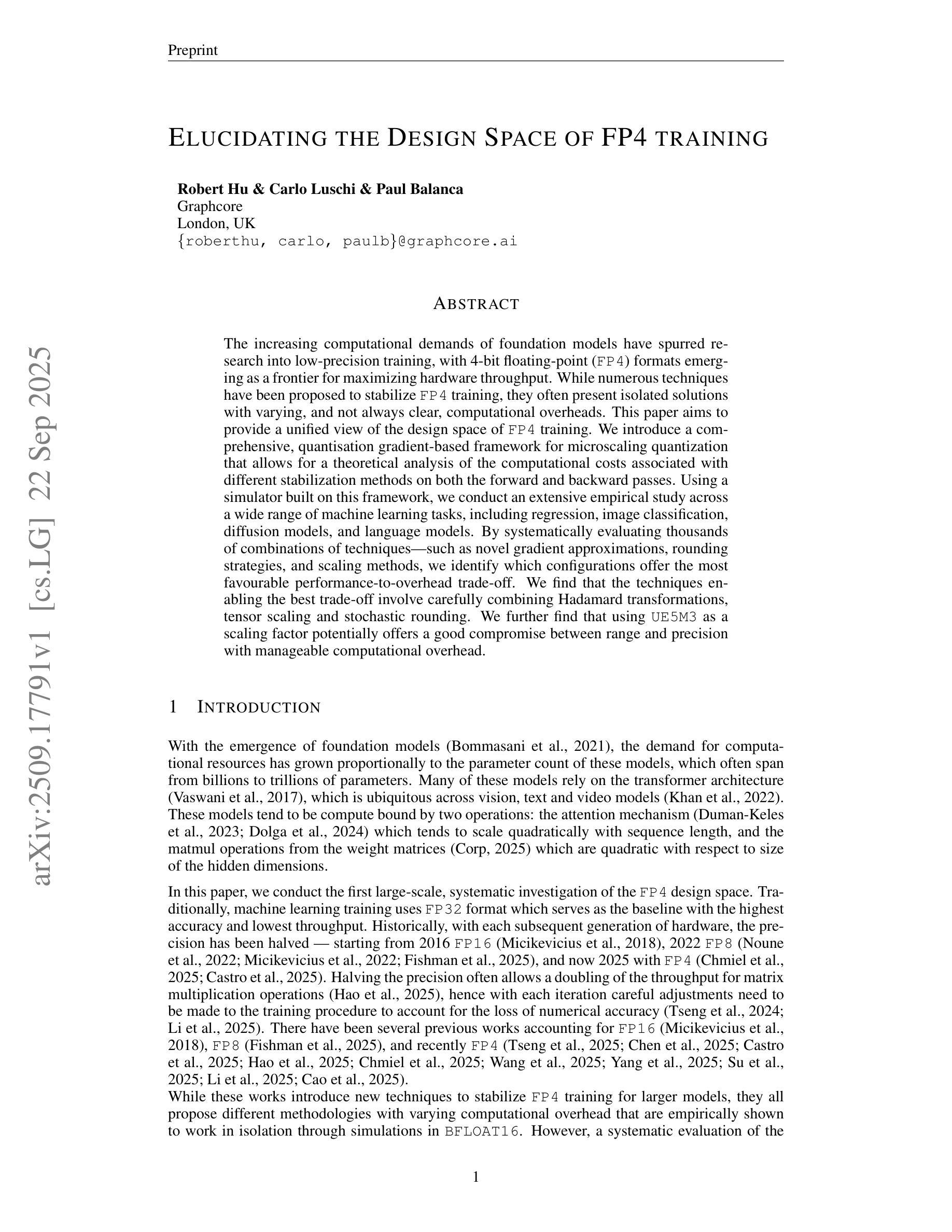 随着基础模型计算需求的不断增加,低精度训练研究应运而生,而4位浮点数(FP4)格式作为最大化硬件吞吐量的前沿技术崭露头角。尽管已经提出了许多技术来稳定FP4训练,但它们通常是孤立的解决方案,计算开销各不相同,并不总是清晰明了。本文旨在为FP4训练的设计空间提供一个统一视图。我们引入了一个全面的、基于量化梯度的微尺度量化框架,该框架可以对正向和反向传递中不同稳定方法与计算成本进行理论分析。使用基于此框架构建的模拟器,我们对一系列广泛的机器学习任务进行了广泛的实证研究,包括回归、图像分类、扩散模型和语言模型。通过系统地评估数千种技术组合,例如新型梯度逼近、舍入策略和调整方法,我们确定了哪些配置提供了最有利于性能与开销之间的权衡。我们发现,能够实现最佳权衡的技术涉及精心结合哈达玛变换、张量缩放和随机舍入。我们进一步发现,使用UE5M3作为调整因子可能在范围和精度之间提供良好的平衡,同时计算开销可控。